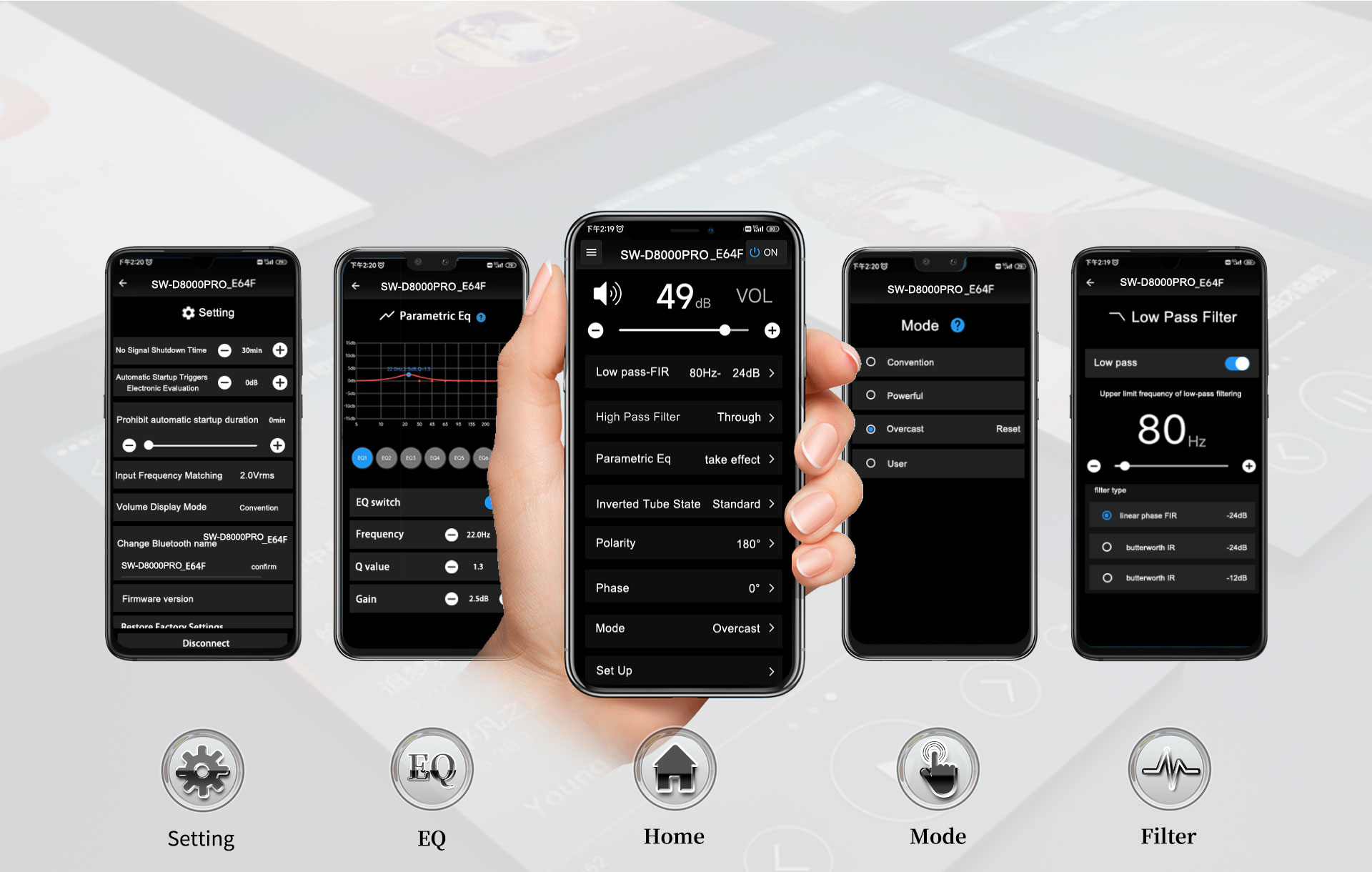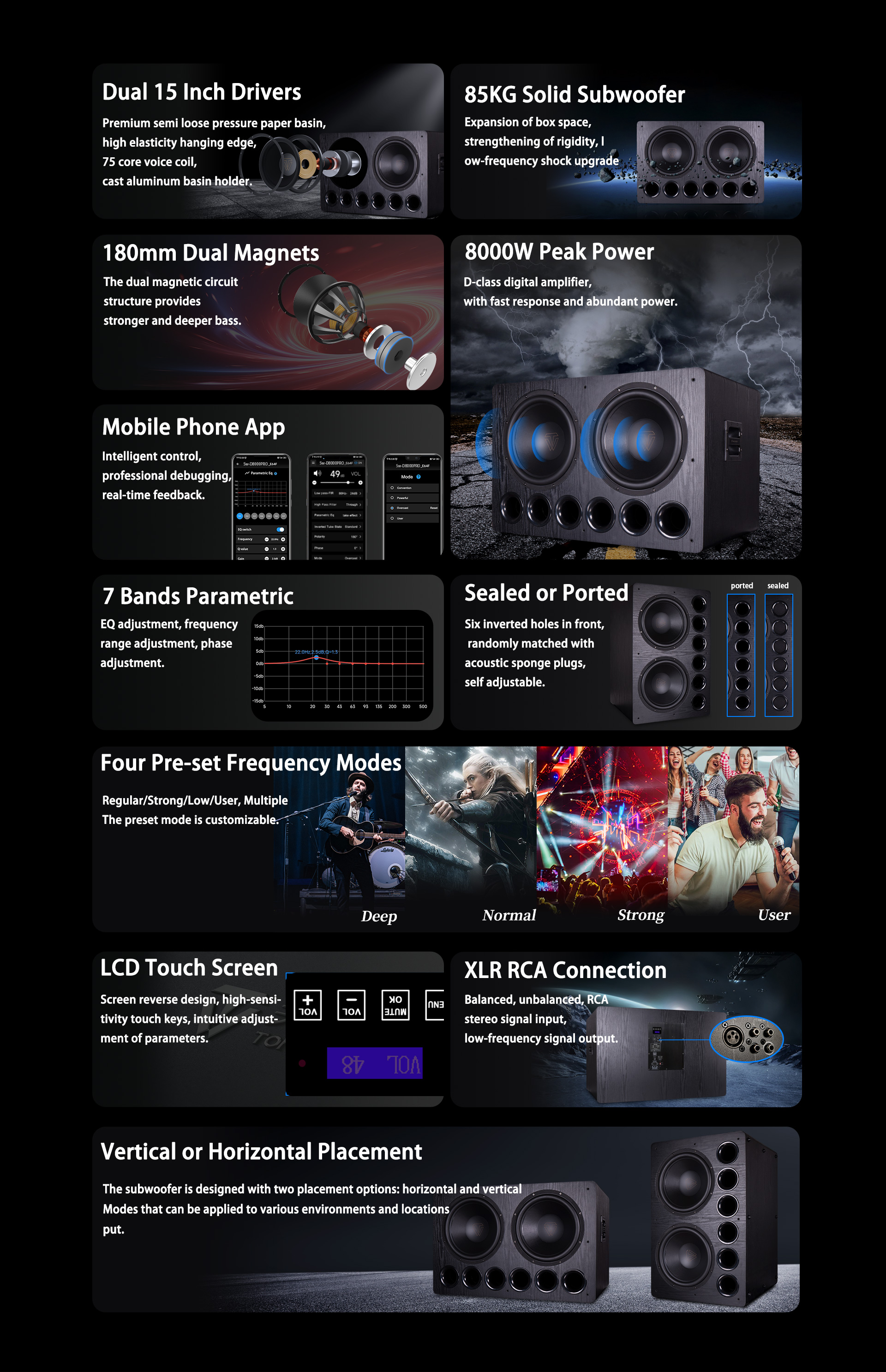 Az SW-D8000PRO egy dupla 15 hüvelykes, DSP-vel működő mélynyomó, 1500 W RMS/3 Ω és 8000 W/3 Ω csúcsteljesítménnyel, hogy lenyűgöző basszussal töltse meg a szobát. D osztályú erősítővel és beépített DSP-vel rendelkezik. Beépített Bluetooth-szal rendelkezik, és támogatja a mobiltelefon-alkalmazást a hangerő, a portok hangolása, a polaritás, a 0°-180° fázis, a HPF, az LPF, a meredekség, az EQ, a jel nélküli készenlét, az ébresztési szint, a bemeneti szint illesztése és négy hallgatási mód beállításához. XLR bemenettel, RCA bemenettel és mélynyomó kimenettel rendelkezik. A masszív MDF ház, az LCD érintőképernyő és a vezeték nélküli szoftverfrissítés magával ragadóbb és lüktetőbb basszusélményt nyújt.