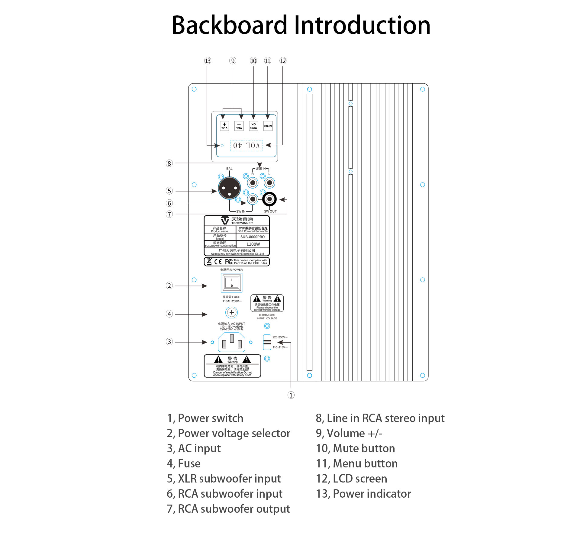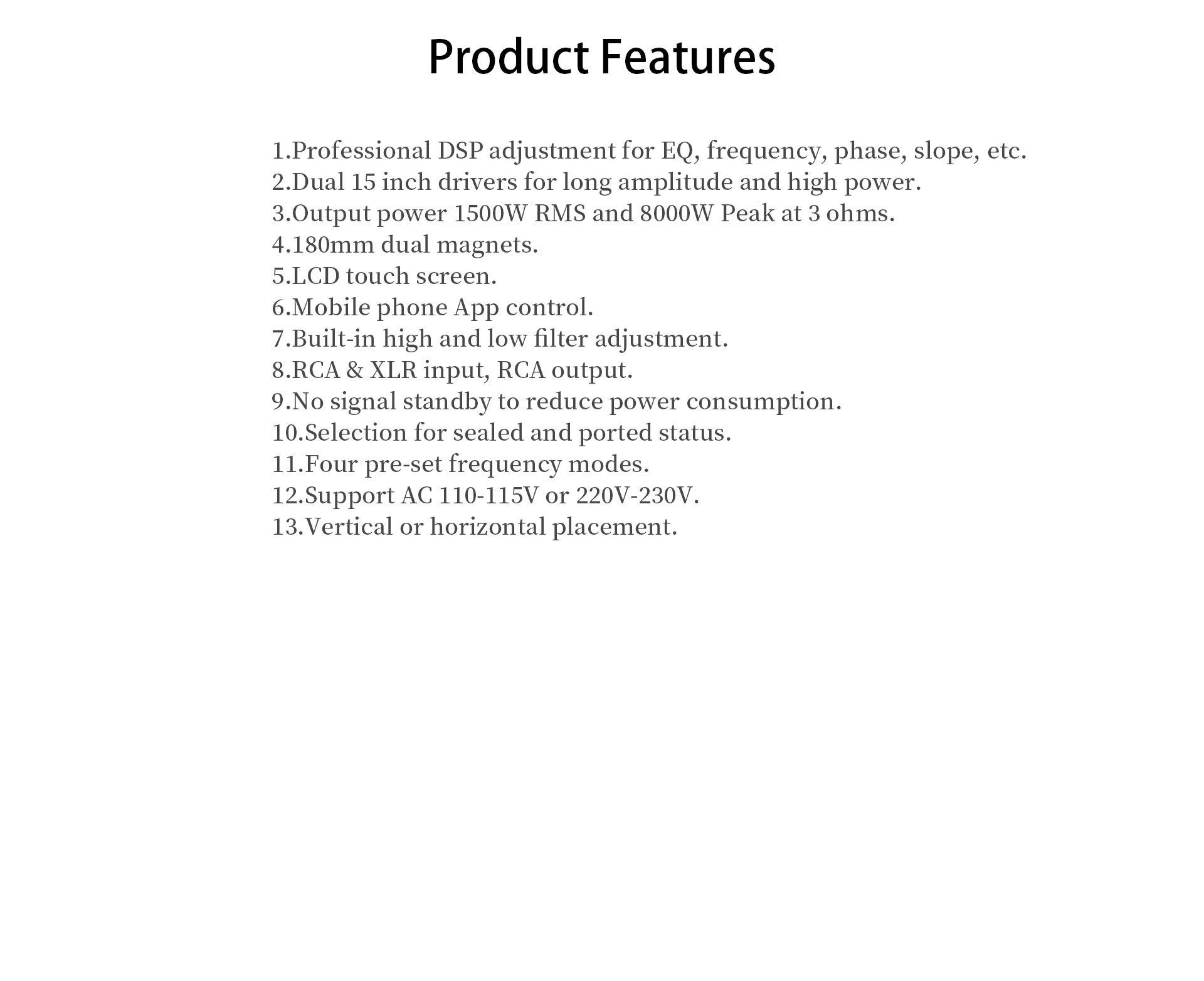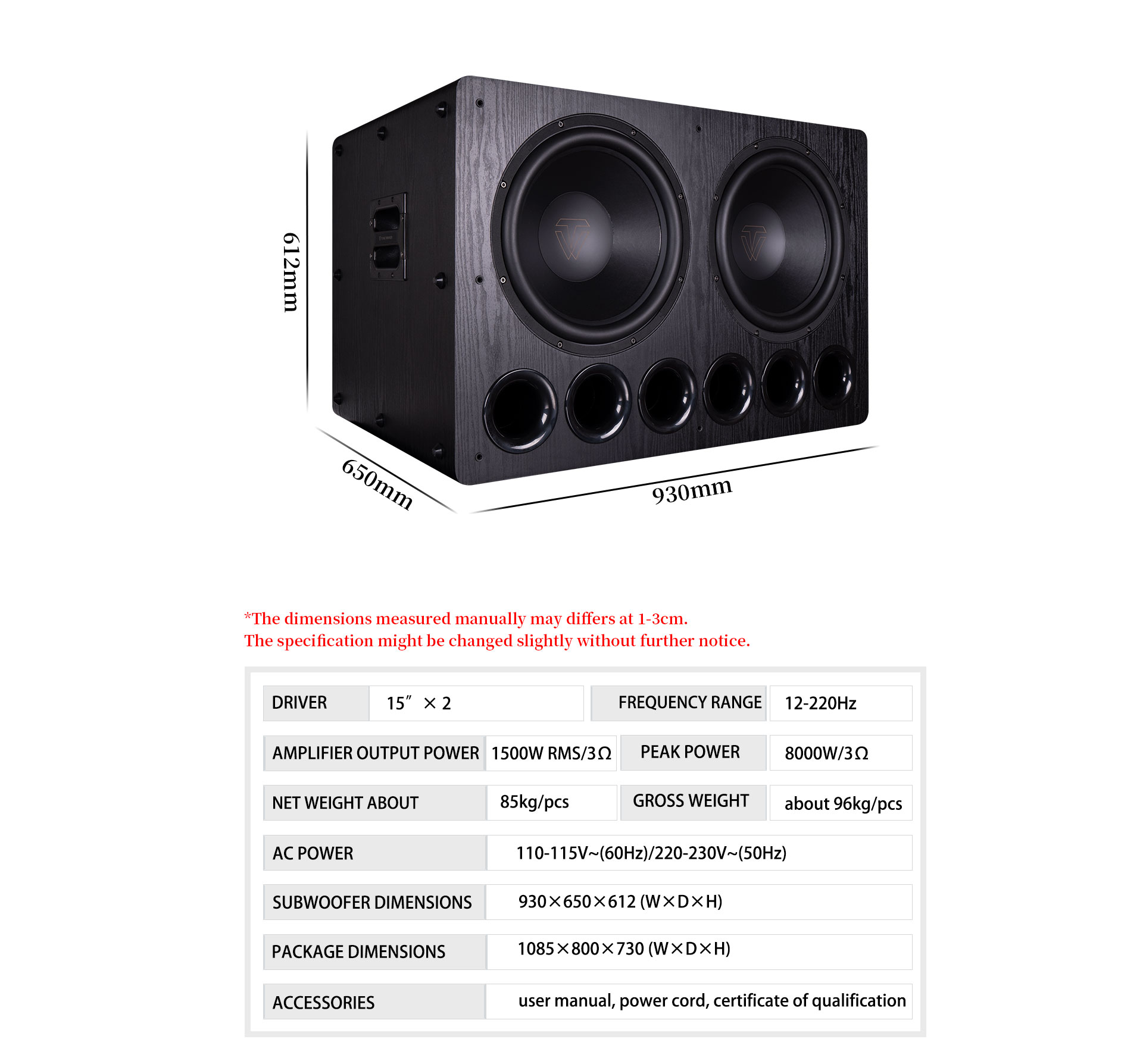 | Sofőr | 15''×2 | Tápegység | 110-115V~(60Hz)/220-230V~(50Hz) |