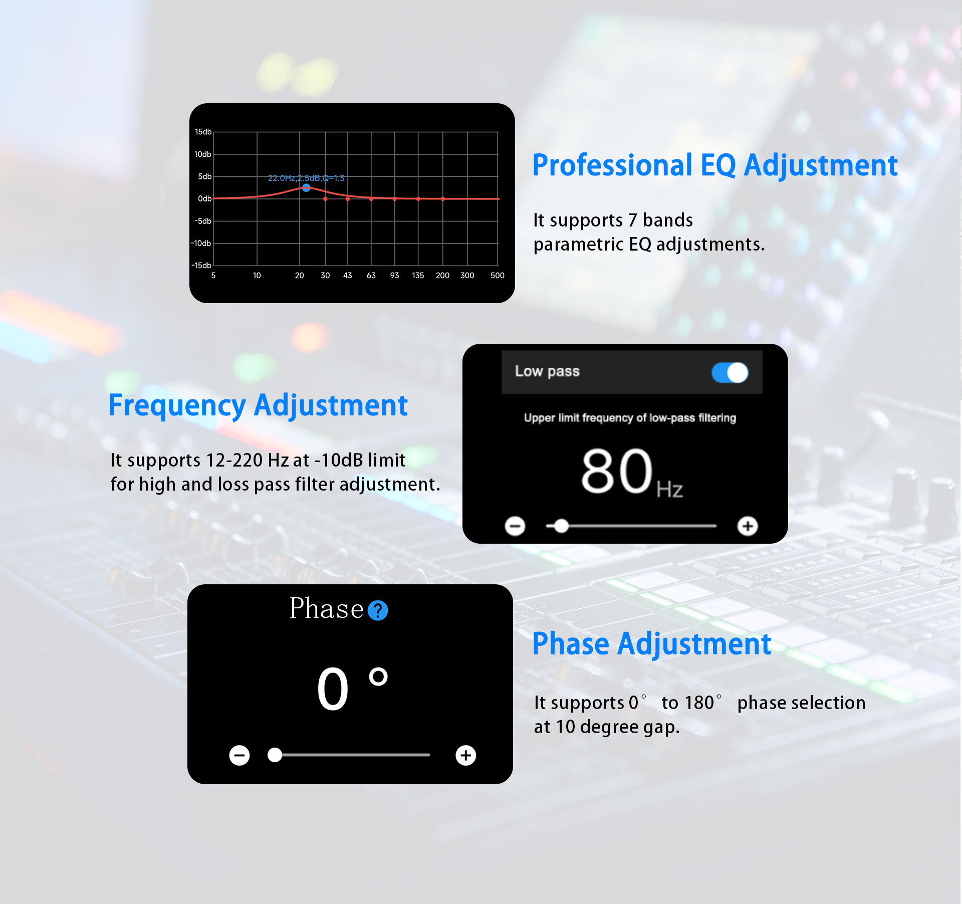 Akusztikus szivaccsal rugalmasan lezárhatod a basszusreflex nyílásokat. Válaszd ki az alkalmazásodban a Zárt módot, és válts zárt mélynyomóra. A négy előre beállított frekvenciamód mély, normál, erős és felhasználói módokat tartalmaz a különböző jelenetekhez és tevékenységekhez. .