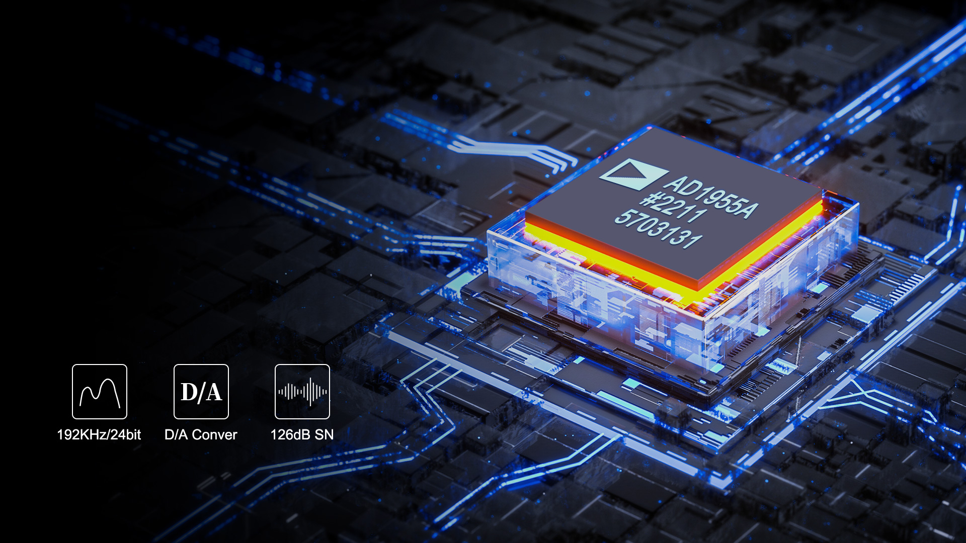 Használja a kritikusok által elismert AD-1955 DAC chipet, amely kivételes 192 kHz/24 bites mintavételi pontosságot és kvantálási szabványokat biztosít. Független digitális szűréssel és D/A konverzióval rendelkezik, kiemelkedő 126 dB dinamikatartománnyal és jel-zaj viszonnyal.