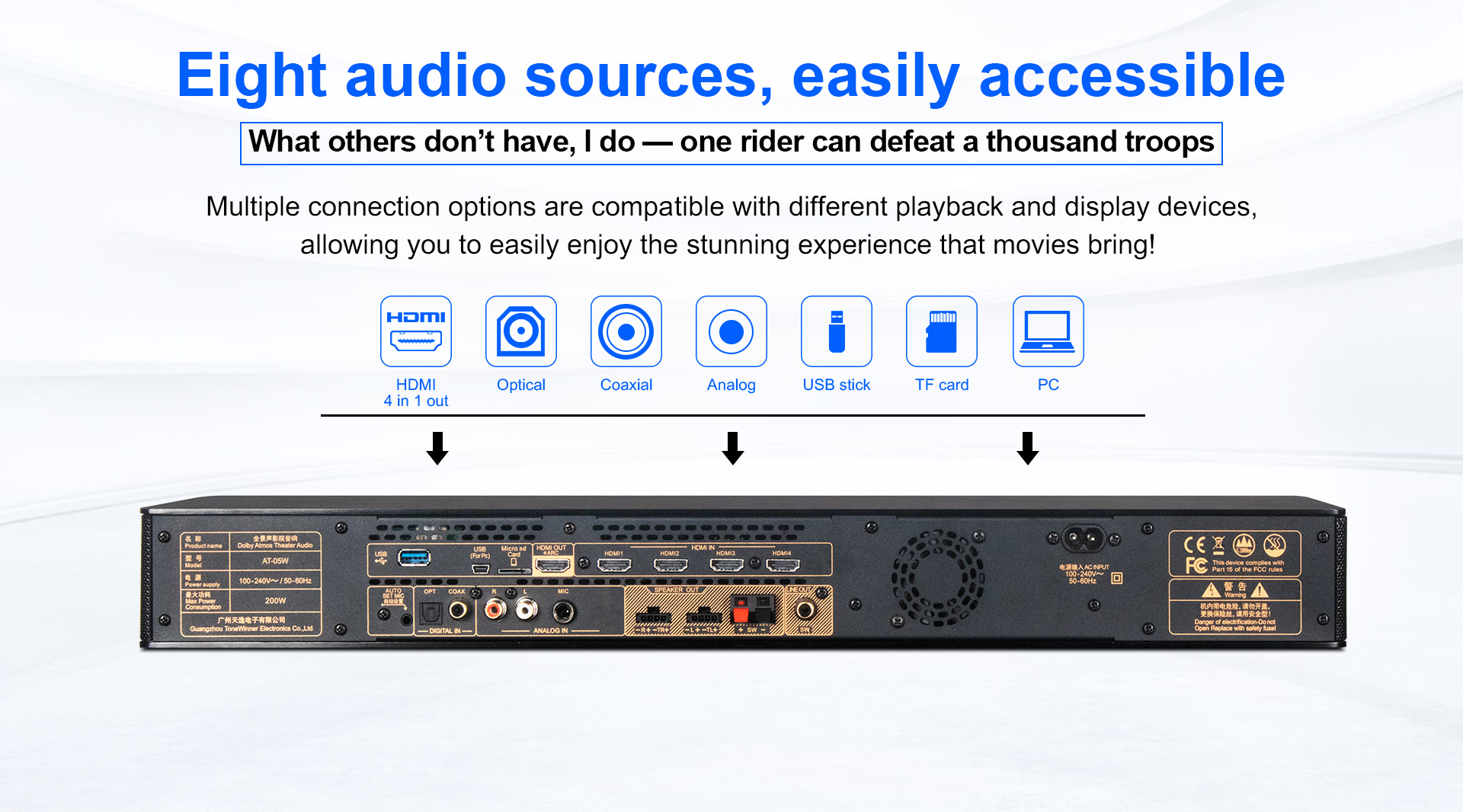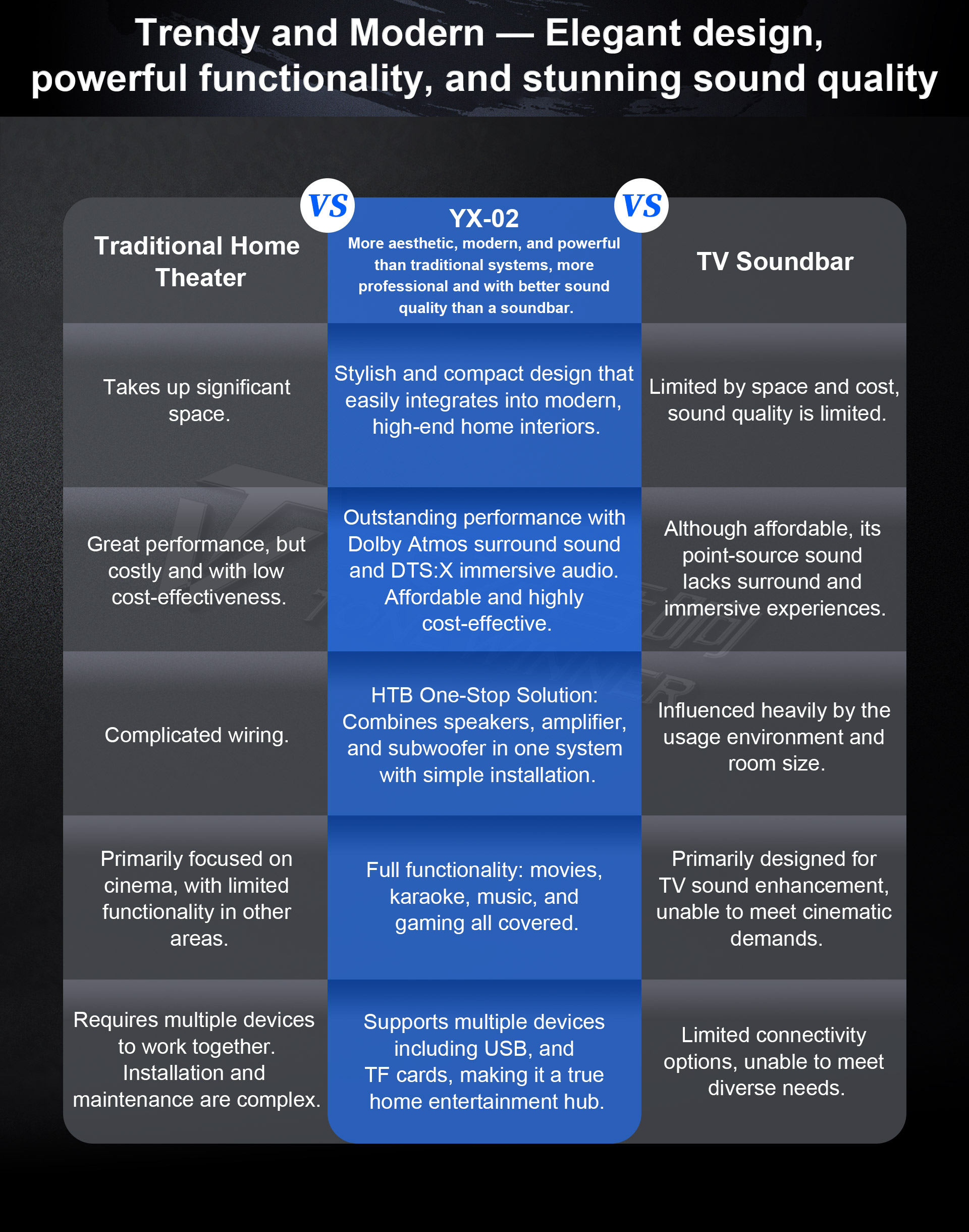 A Tonewinner YX-02P egy többfunkciós házimozi rendszer, amely ötvözi a Dolby Atmos surround hangzást, a professzionális KTV-t, a Hi-Fi zenét és a játékélményt. 5.1.4-es hangszórórendszerrel rendelkezik, amely támogatja mind a Dolby Atmos, mind a DTS:X immerzív hangformátumokat. Ezenkívül támogatja a 4K videót, így páratlanul magával ragadó élményt nyújt. A rendszer professzionális szintű 5.1.4 csatornás surround hangzást kínál karaoke-hoz, okostelefon-alkalmazás vezérléshez, USB/TF kártya kompatibilitáshoz, vezeték nélküli veszteségmentes átvitelhez és eARC audio visszhanghoz.
