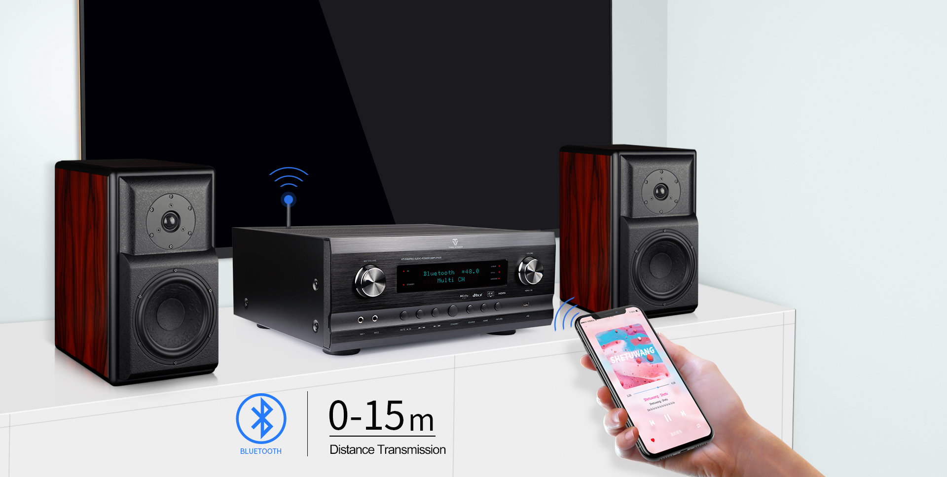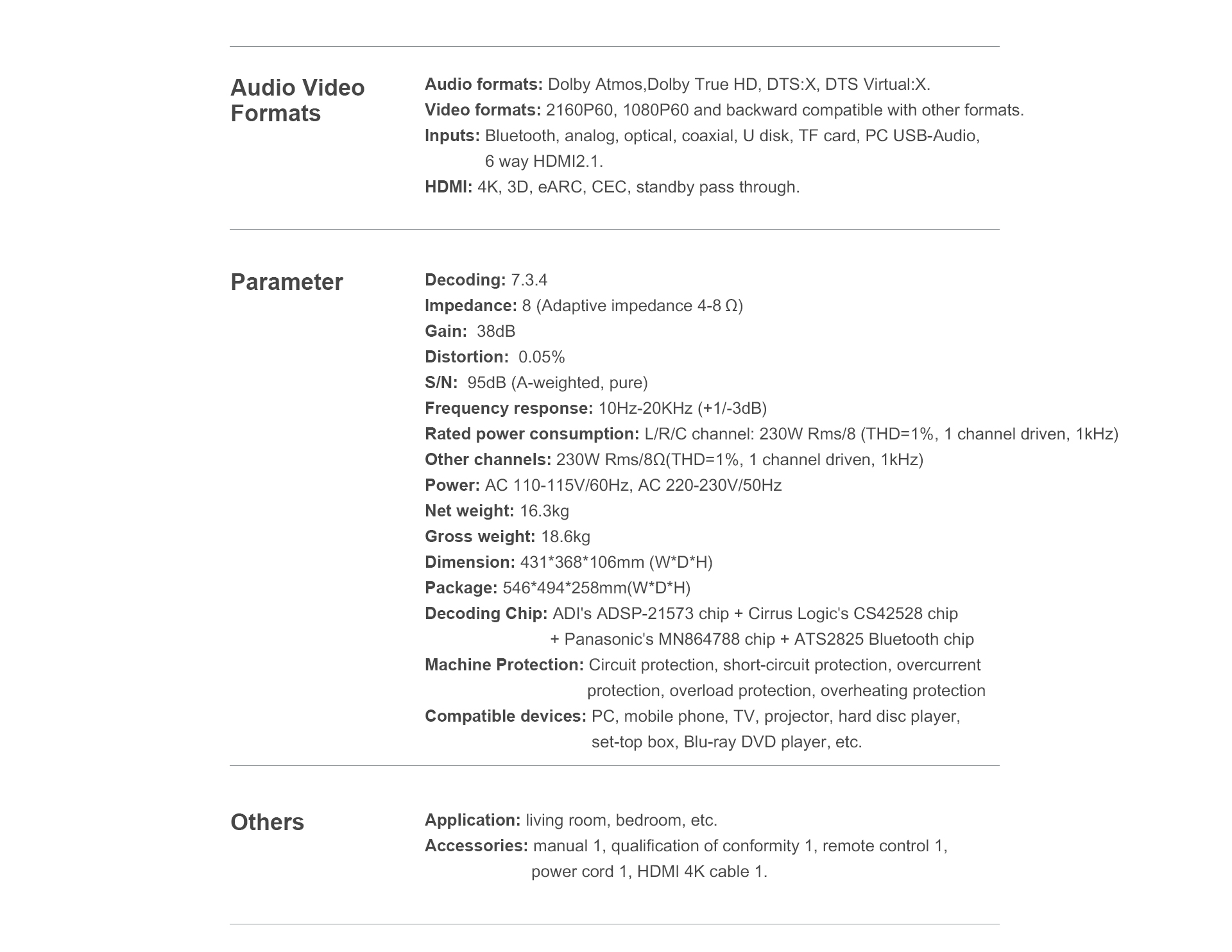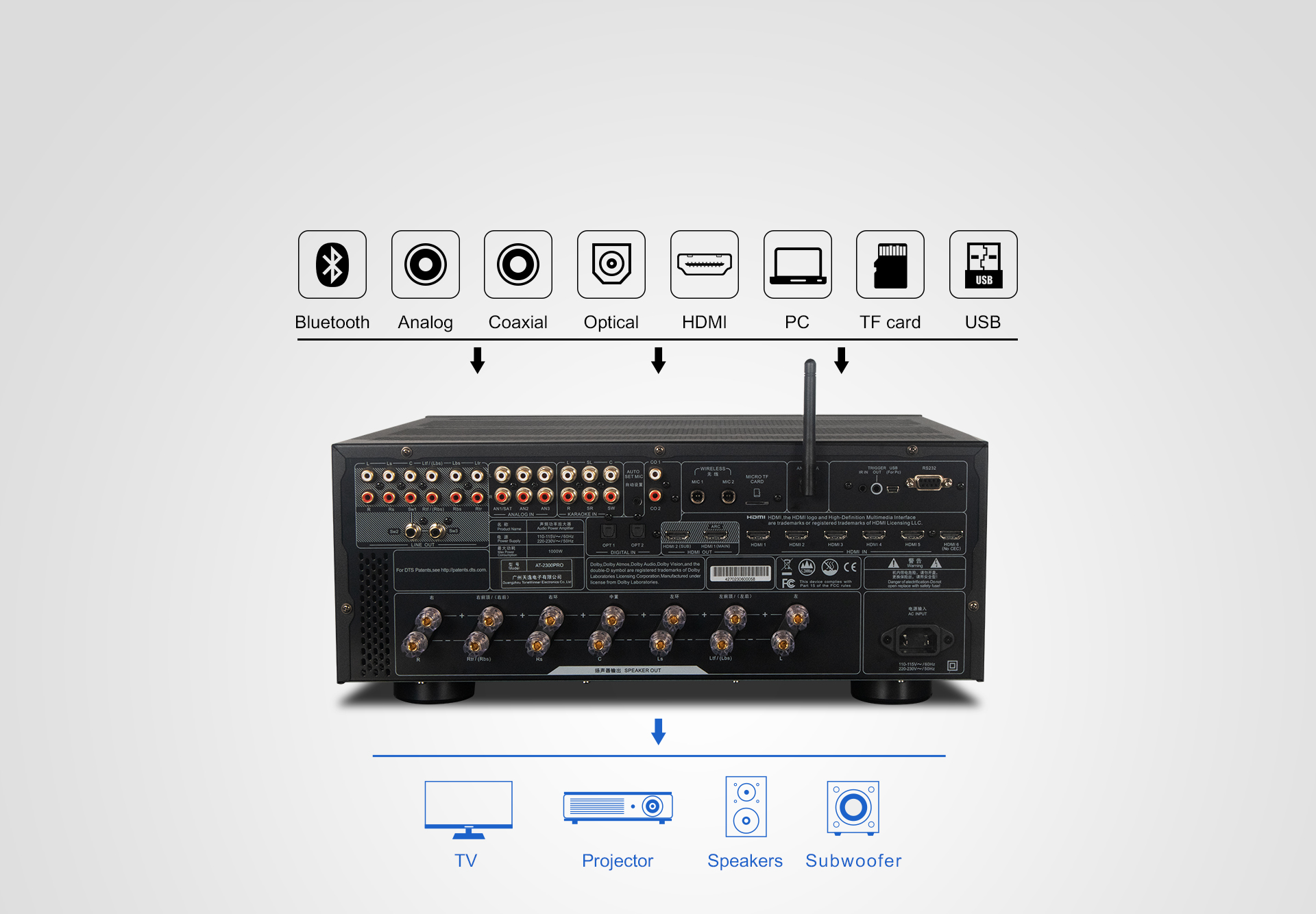 Támogatja a HDMl 6 bemenetet és 2 kimenetet, ARc, optikai/koaxiális bemeneteket, U disc/TF kártya/Pc audio bemeneteket, Bluetooth-t,