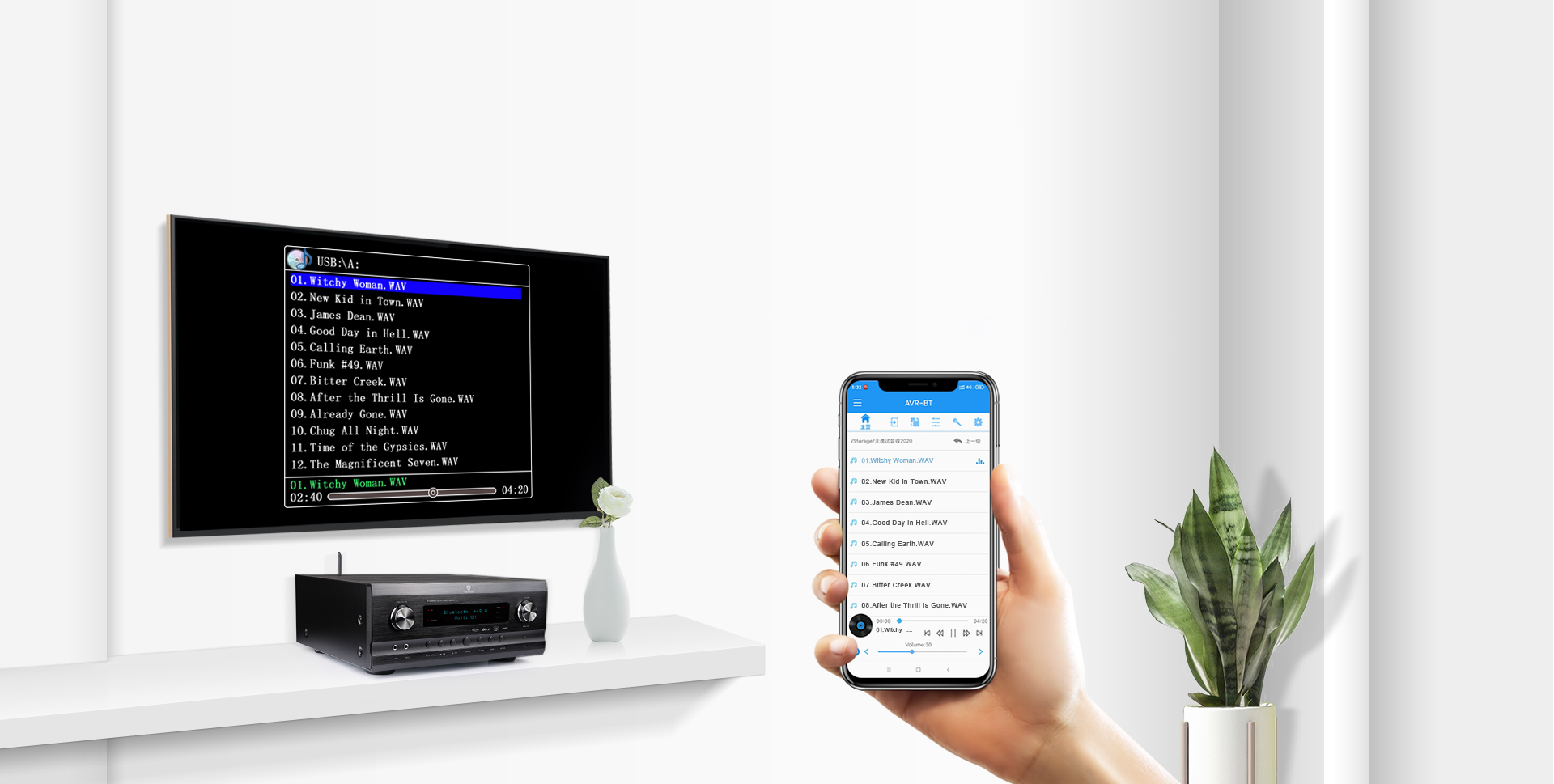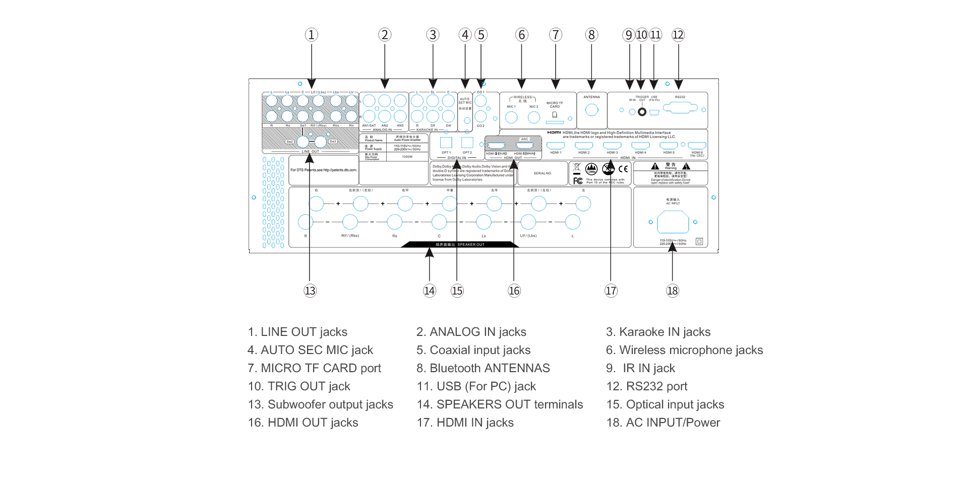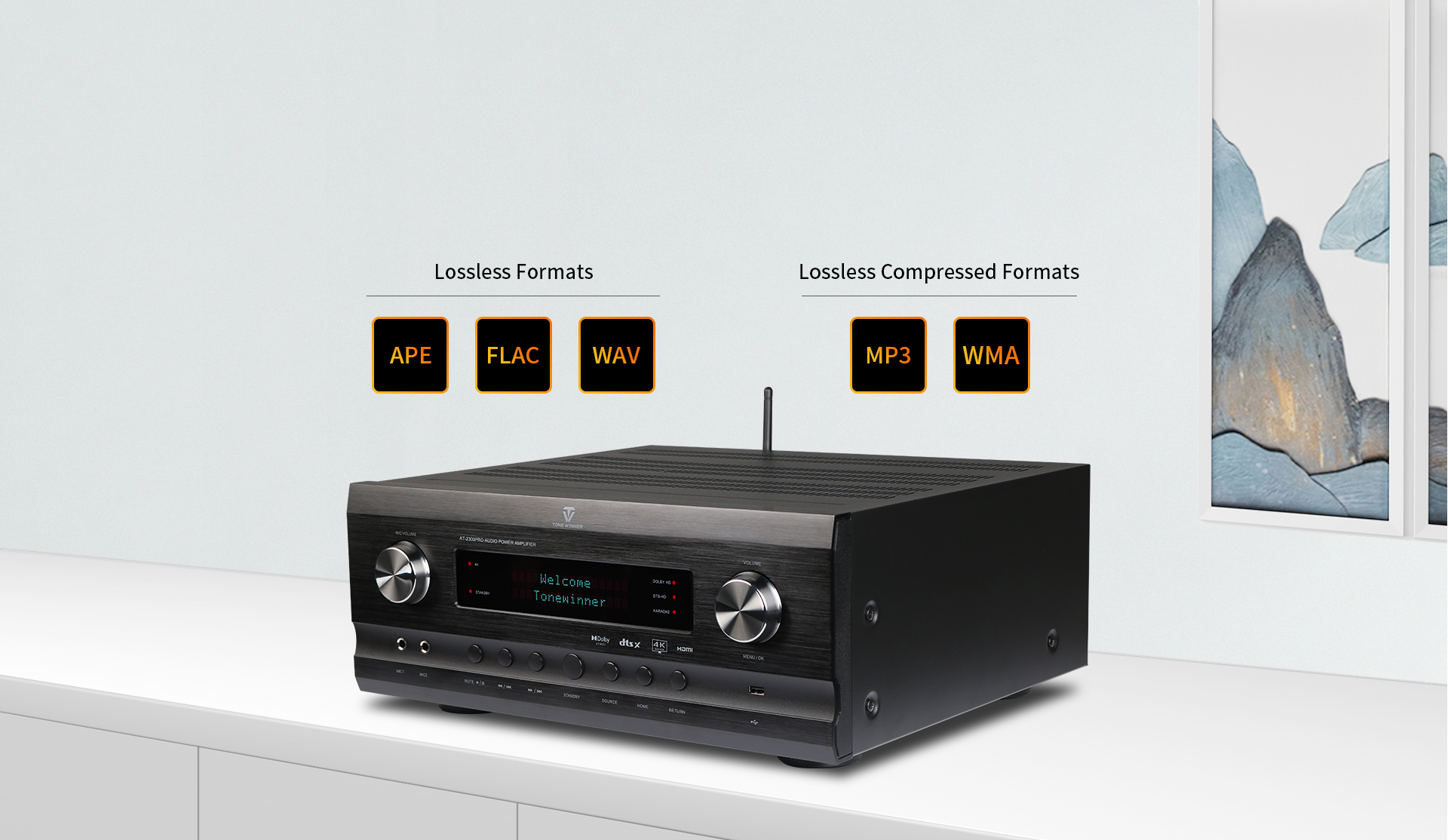 Támogatja a HDMl 6 bemenetet és 2 kimenetet, ARc, optikai/koaxiális bemeneteket, U disc/TF kártya/Pc audio bemeneteket, Bluetooth-t,