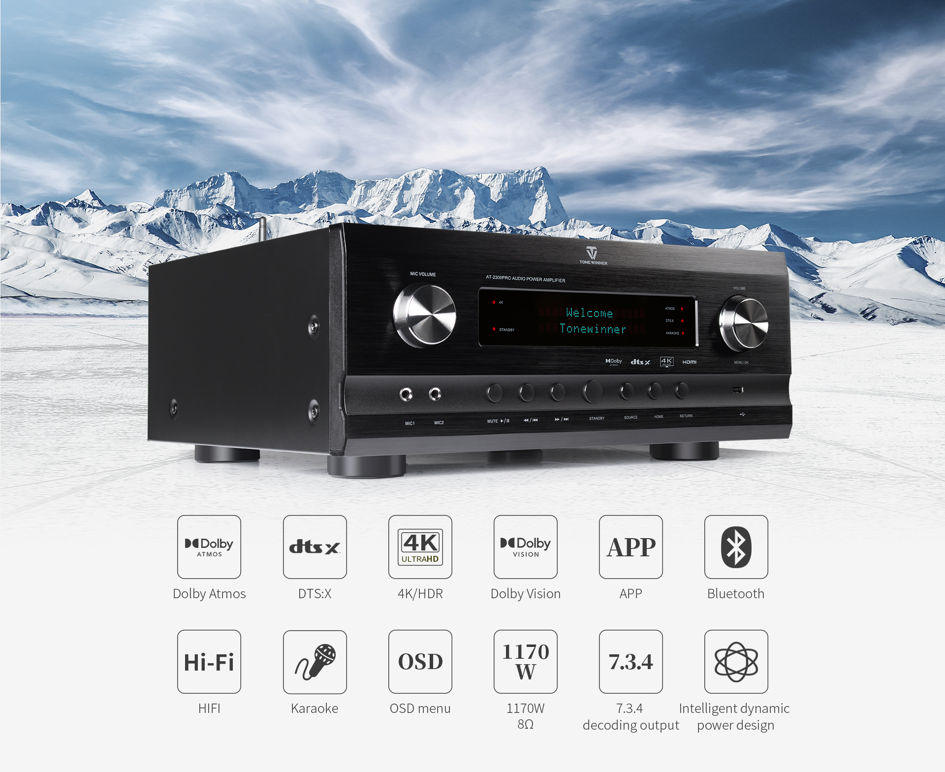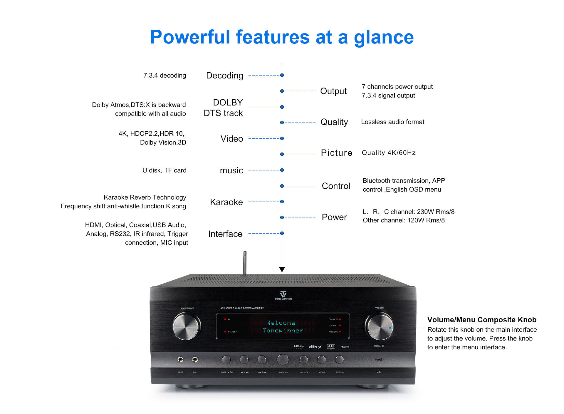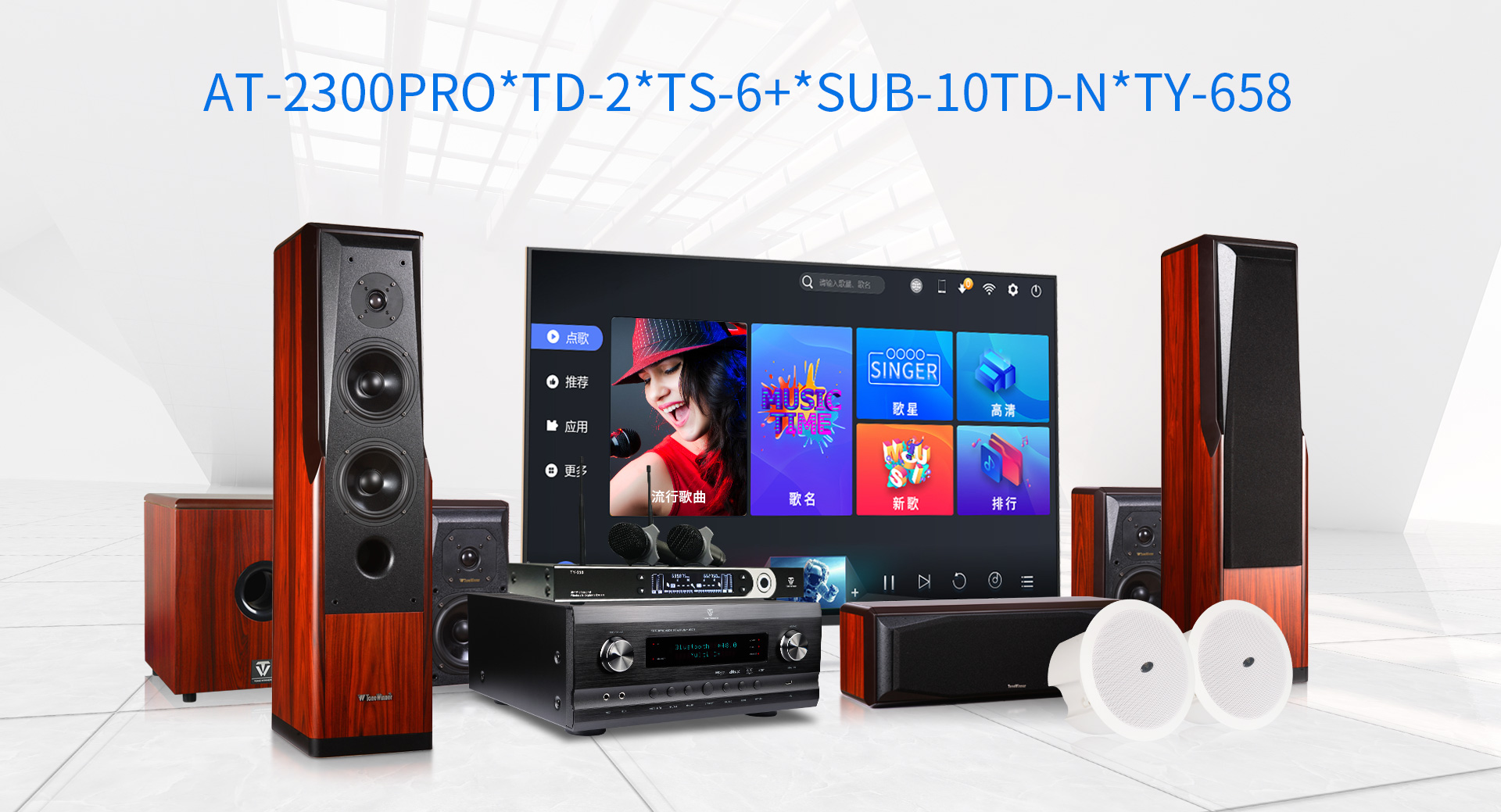 Az AT-2300PRO egy Dolby Atmos házimozi és karaoke integrált erősítő. Ez egy minden az egyben készülék, amely ötvözi a házimozi rendszert, a személyi zenei központot és a professzionális karaoke rendszert. Az AT-2300PRO professzionális 5.1.2 csatornás immerziós karaoke rendszere úttörő az audioiparban. Támogatja az audio visszirányú csatornát (ARC), amely az okostévét dalrendezővé alakíthatja.