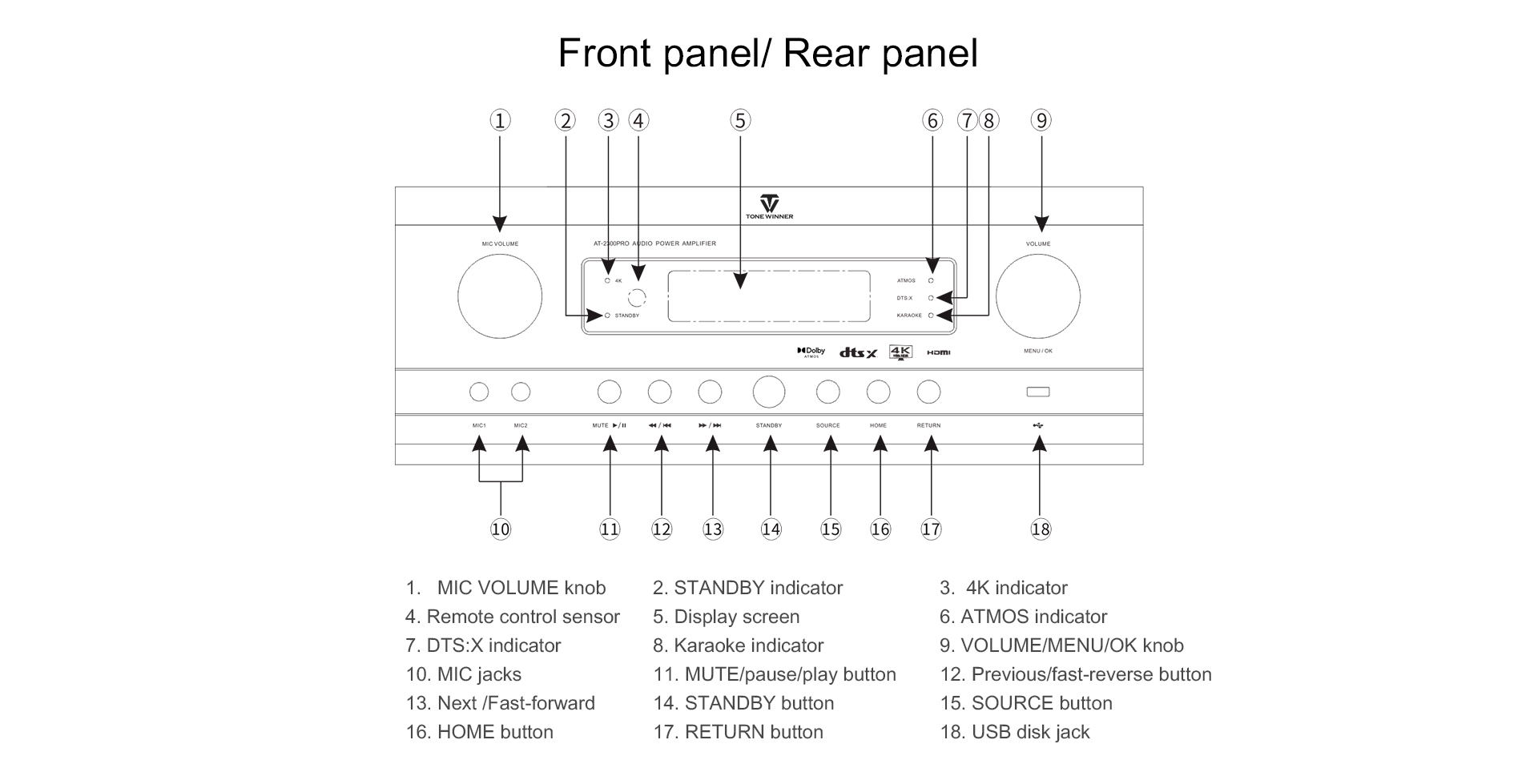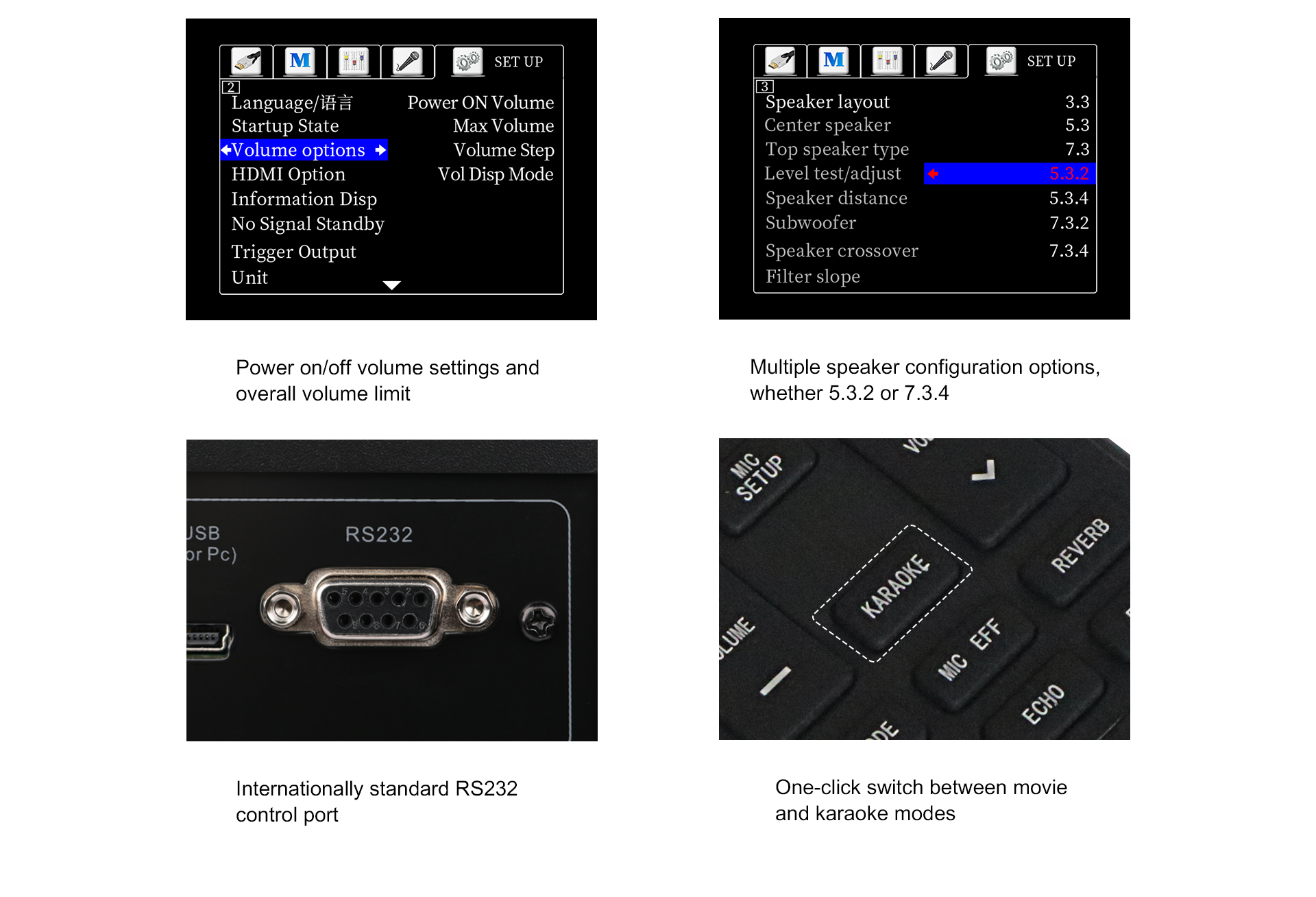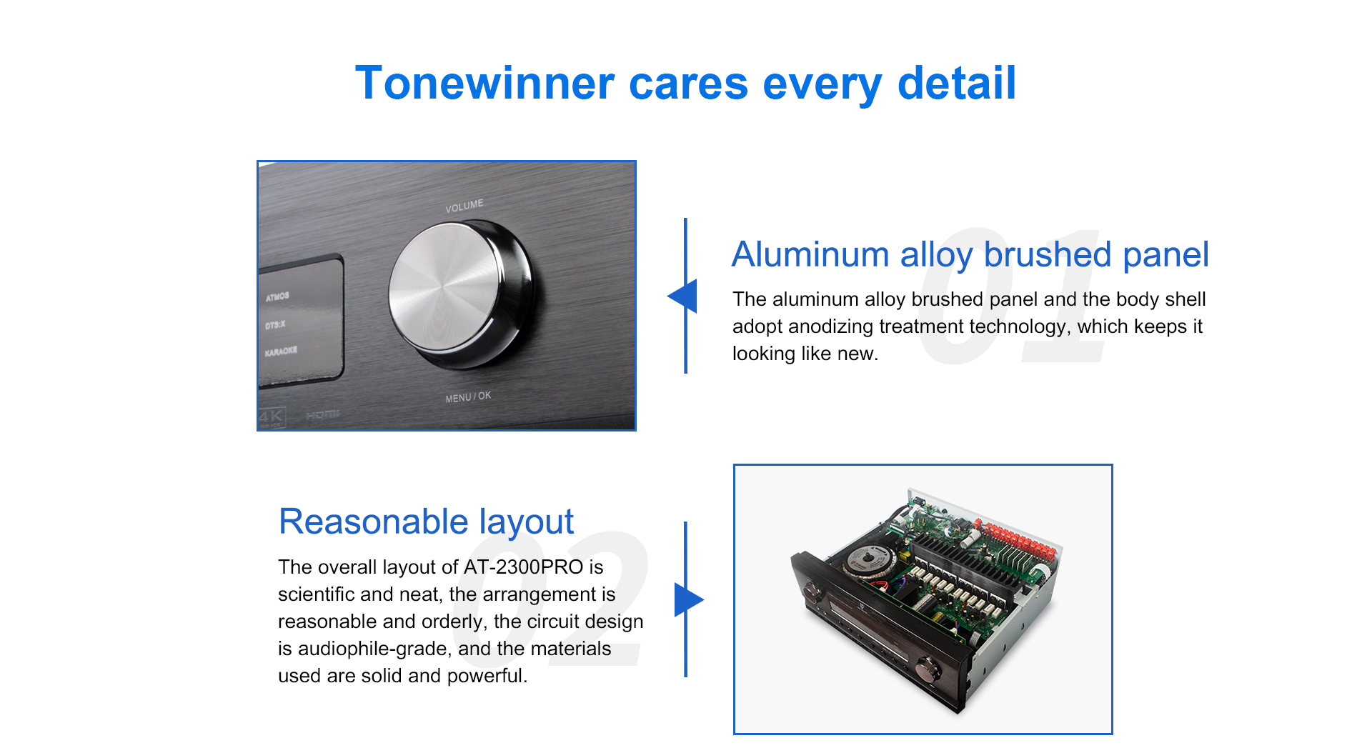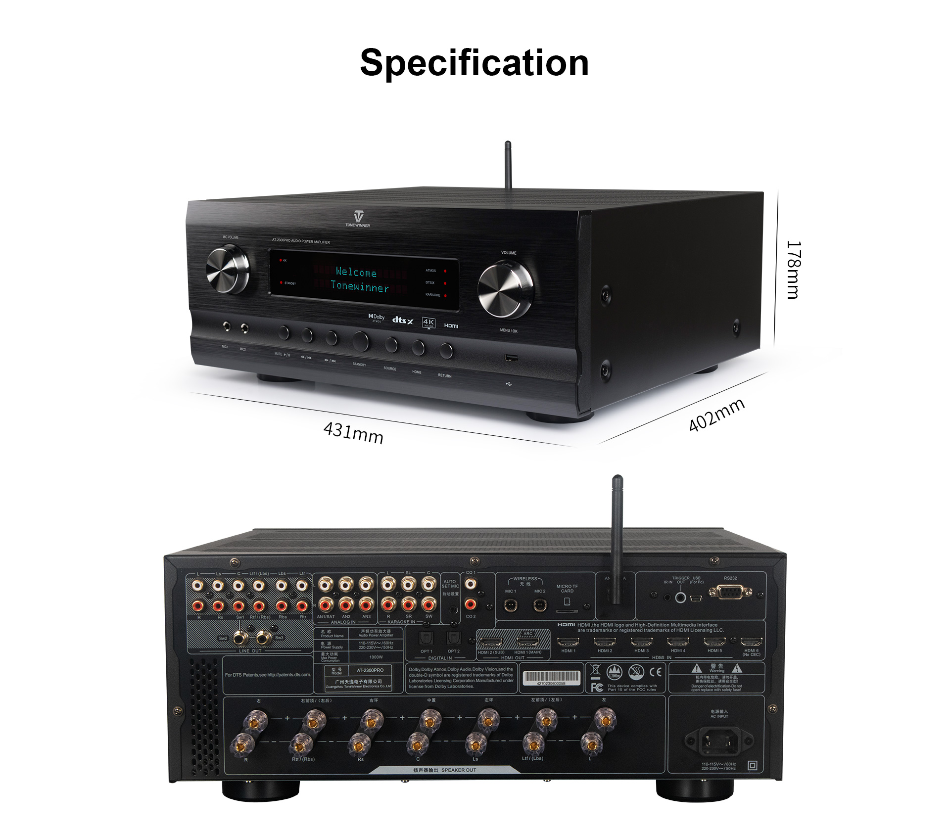 Az AT-2300PRO egy Dolby Atmos házimozi és karaoke integrált erősítő. Ez egy minden az egyben készülék, amely ötvözi a házimozi rendszert, a személyi zenei központot és a professzionális karaoke rendszert. Az AT-2300PRO professzionális 5.1.2 csatornás immerziós karaoke rendszere úttörő az audioiparban. Támogatja az audio visszirányú csatornát (ARC), amely az okostévét dalrendezővé alakíthatja.