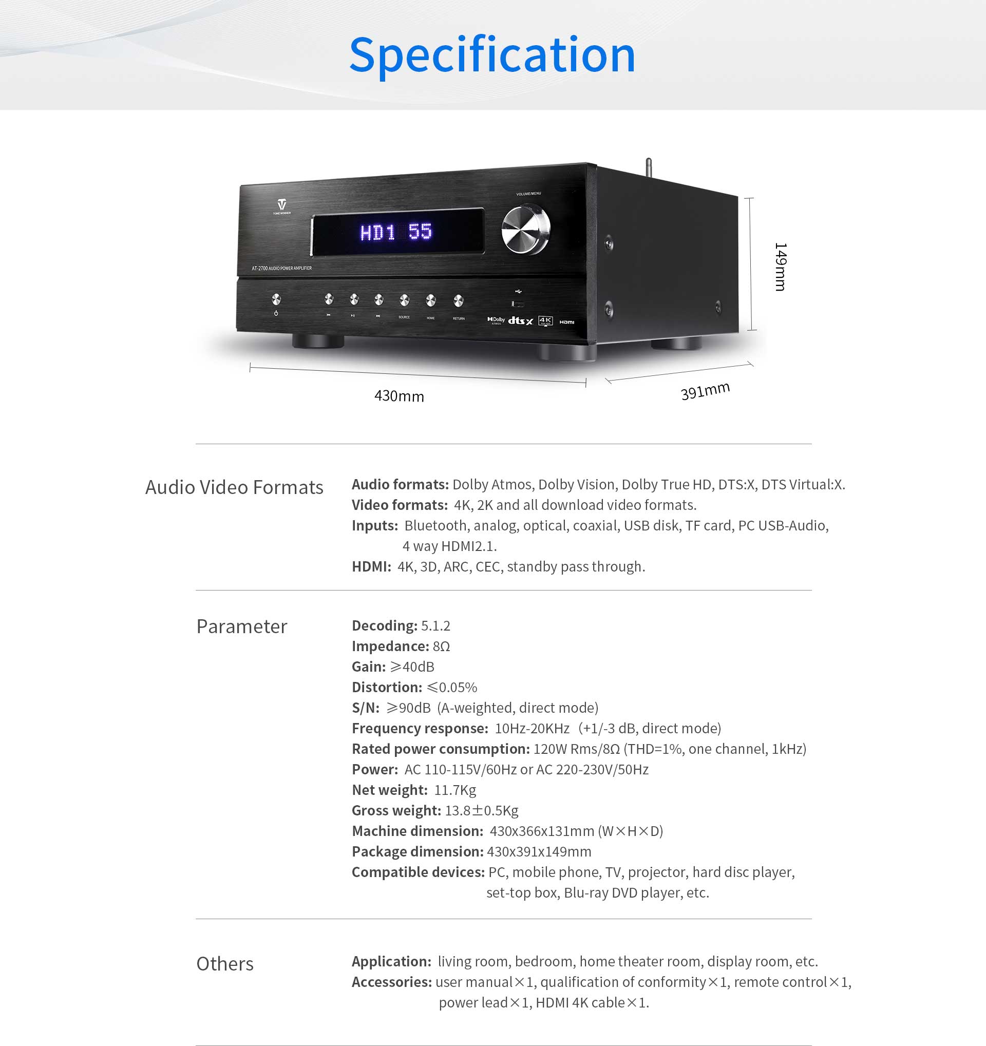 Az AT-2700 egy AV receiver integrált erősítő, amely támogatja a Dolby Atmos, DTS:X, 4K, Dolby Vision, HDR stb. formátumokat. Támogatja továbbá az 5.1.2 dekódolást, a Bluetooth-t, a HDMI 4 bemenetet és 2 kimenetet, a CEC vezérlést, az OSD menüt, az RS232-t, a mobiltelefon-alkalmazás vezérlését stb. Kína 10 legjobb audio márkájaként a Tonewinner több mint 30 éves tapasztalattal rendelkezik akusztikai termékek tervezésében és gyártásában. Eredeti beszállítóként a Tonewinner mindig szeretettel várja a forgalmazókat, partnereket és ügyfeleket szerte a világon.