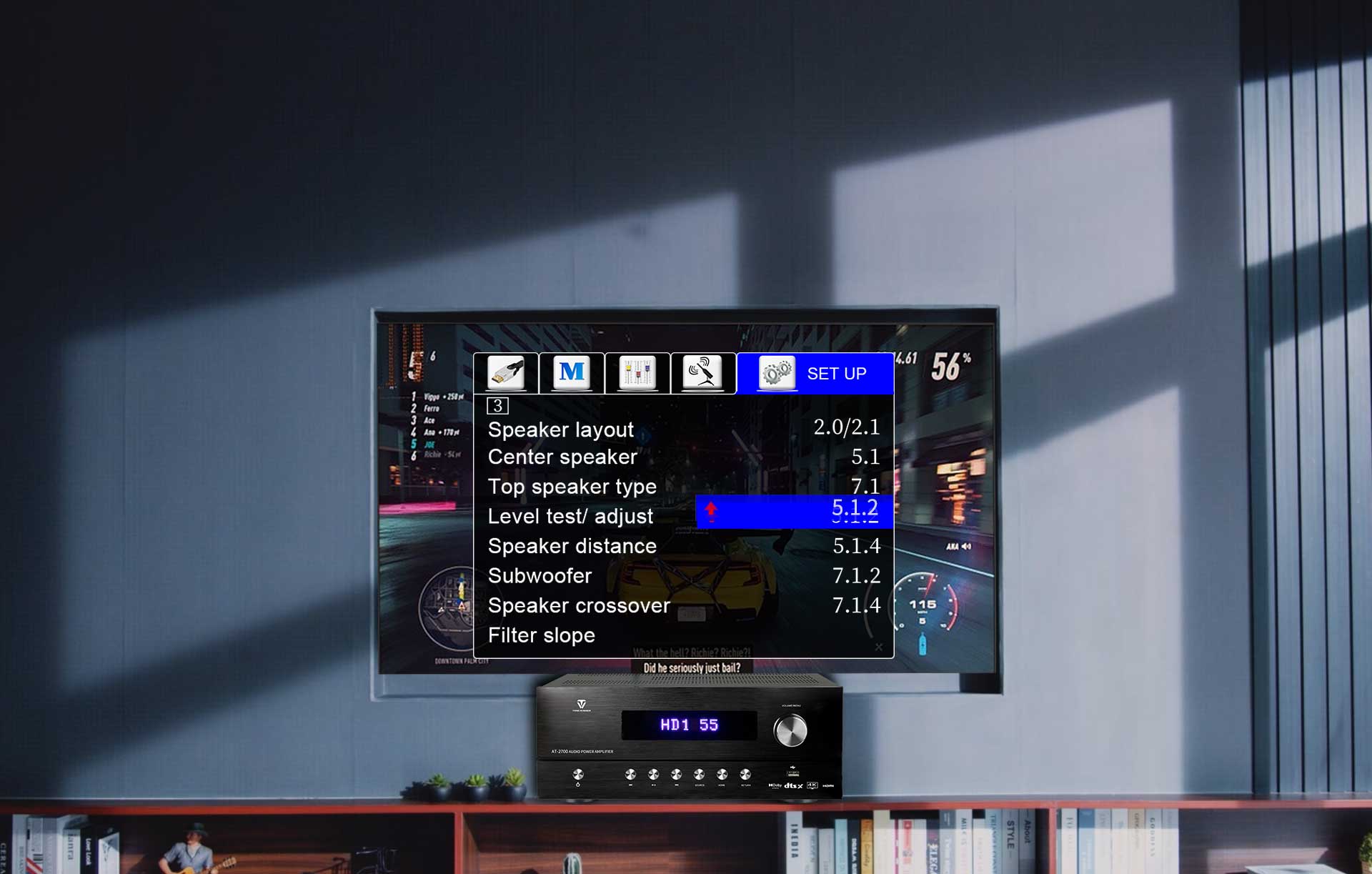 Egyszerű menü a könnyű vezérléshez és beállításhoz. Beállíthatja a paramétereket a jobb hanghatás érdekében a képernyőn, amikor az AV-vevőegység működik.
