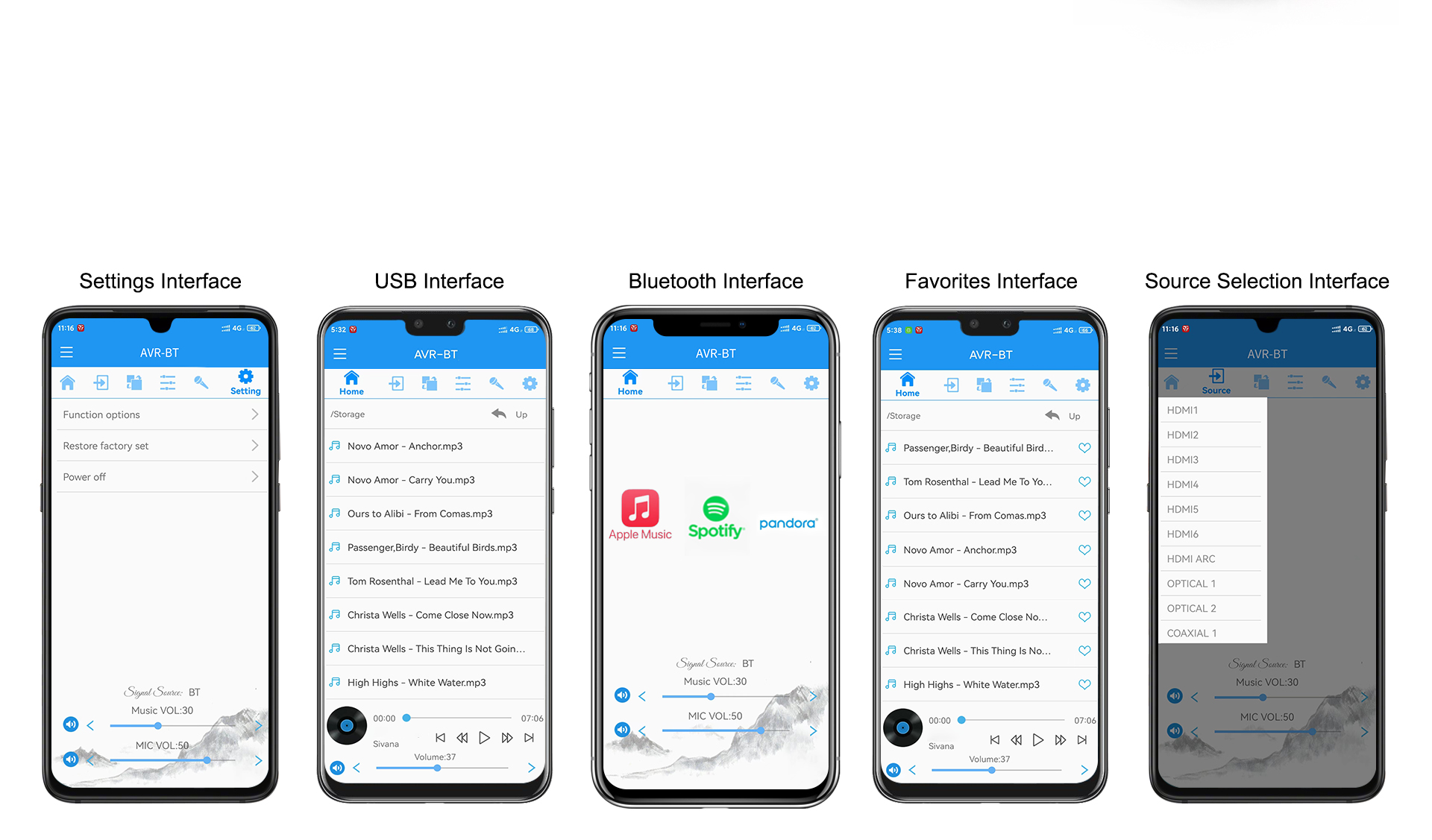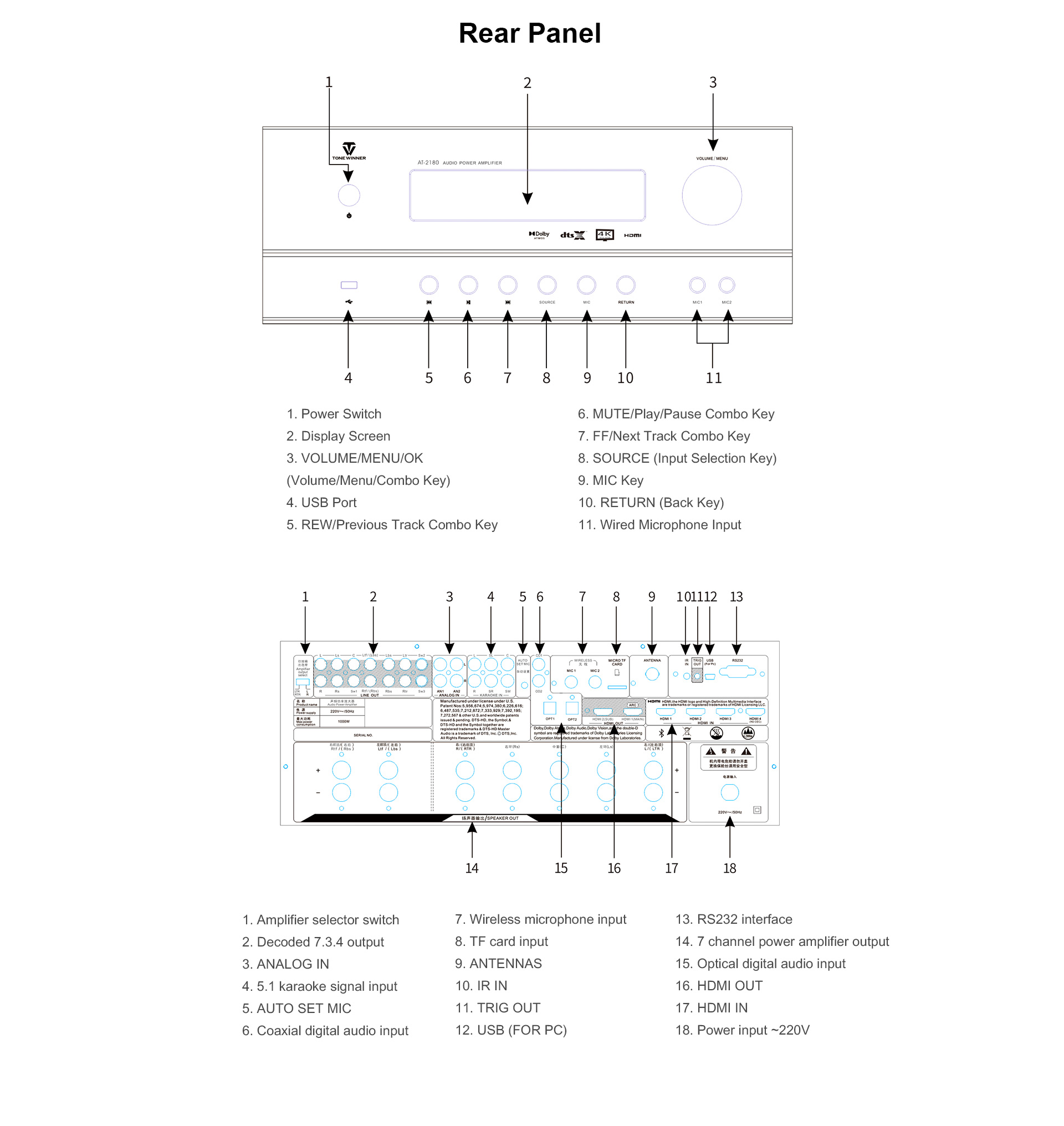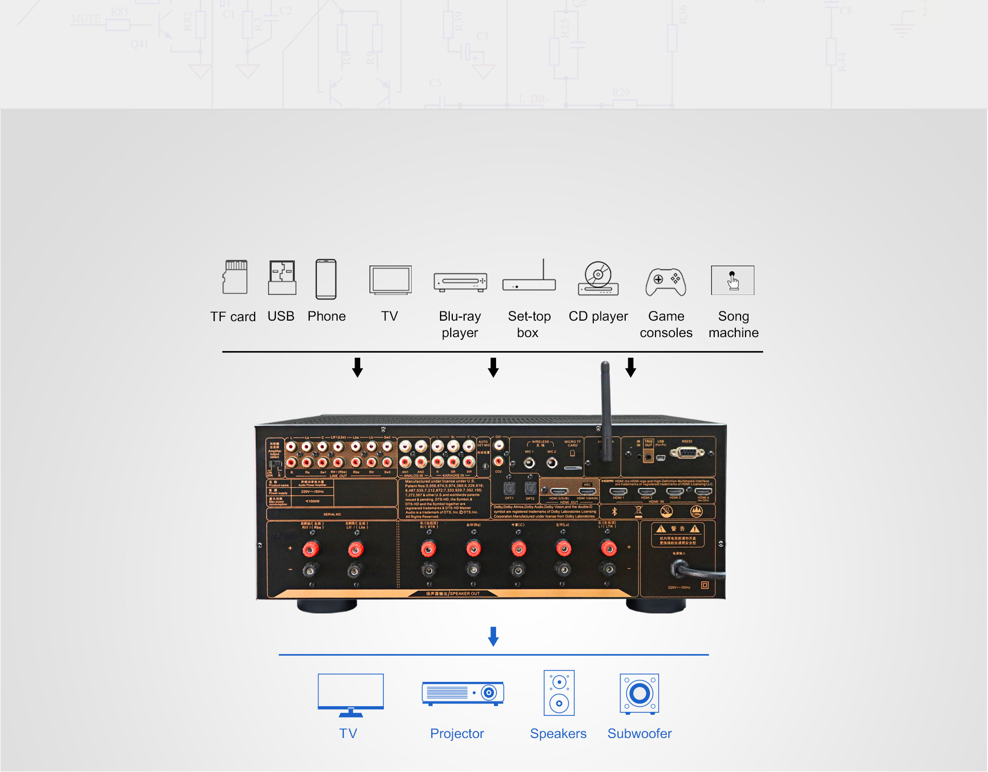 HDMI 4 bemenet, 2 kimenet, támogatja az ARC-t, optikai/koaxiális digitális bemeneteket, USB-meghajtó/TF-kártya/PC audio bemeneteket, Bluetooth veszteségmentes átvitelt, 5V-os trigger kimenetet, IR bemenetet és RS232 szabványú vezérlőportot.