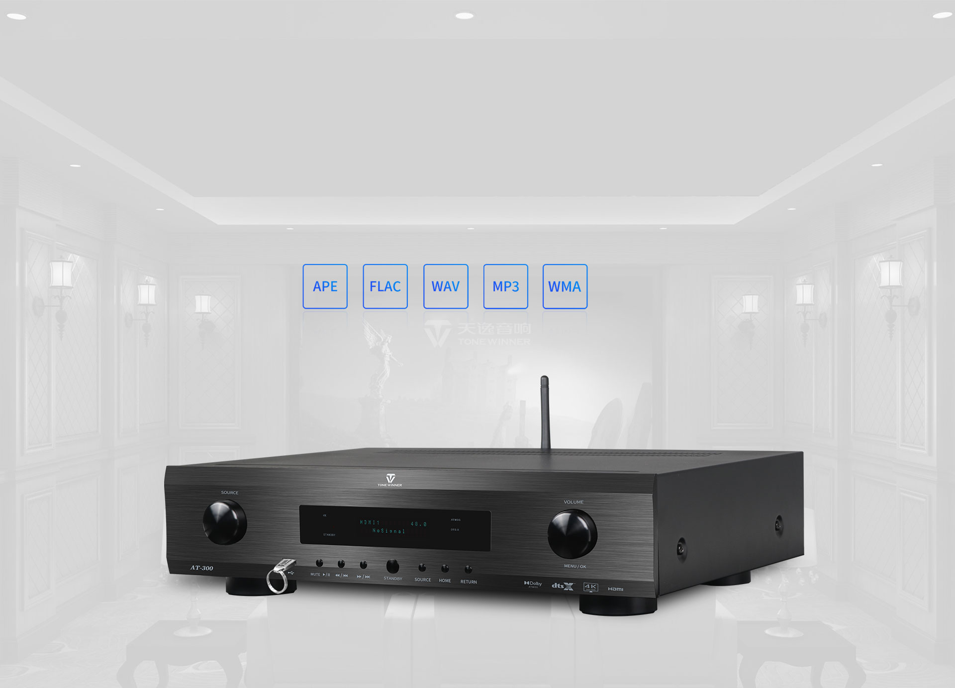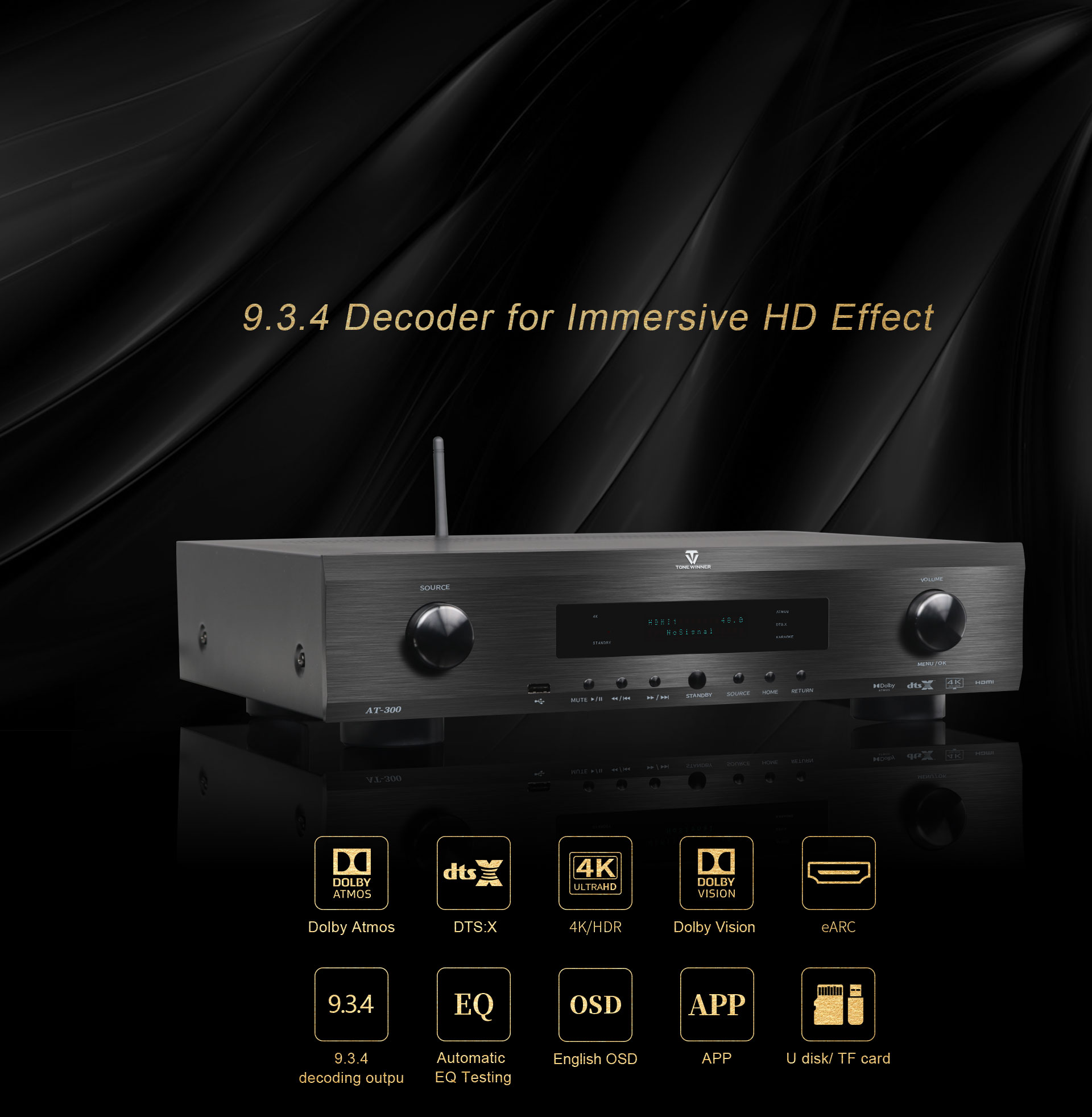 Az AT-300 egy professzionális házimozi és zenei központ integrált audio-video dekóder 9.3.4-es rendszerhez. A dTonewinner több mint 30 éves tervezési tapasztalattal rendelkezik, gyártását és tervezését az amerikai THX cég által elismert mérnökök végezték. Támogatja a 4K dekódolást, és Dolby Atmos, DTS:X és HDMI2.0 tanúsítvánnyal rendelkezik.