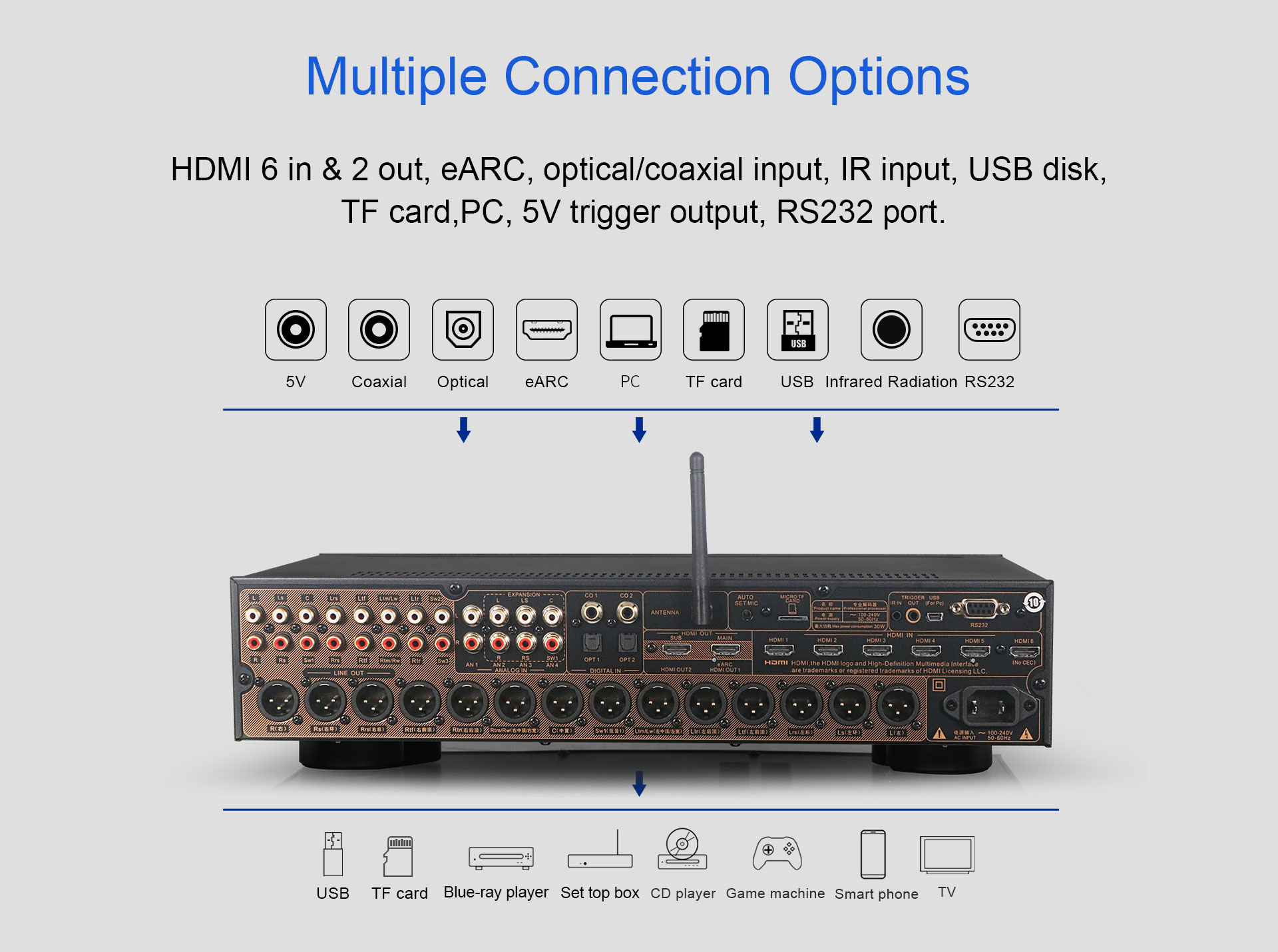 Az AT-300 egy 16 csatornás házimozi AV dekóder Ez professzionális processzor támogatja a 4K felbontást, és rendelkezik Dolby Atmos, DTS:X és HDMI2.0 tanúsítvánnyal. többfunkciós dekóder , ez az előerősítő házakban, mozikban és színházakban használható magával ragadó 3D Hi-Fi hanghatás eléréséhez.