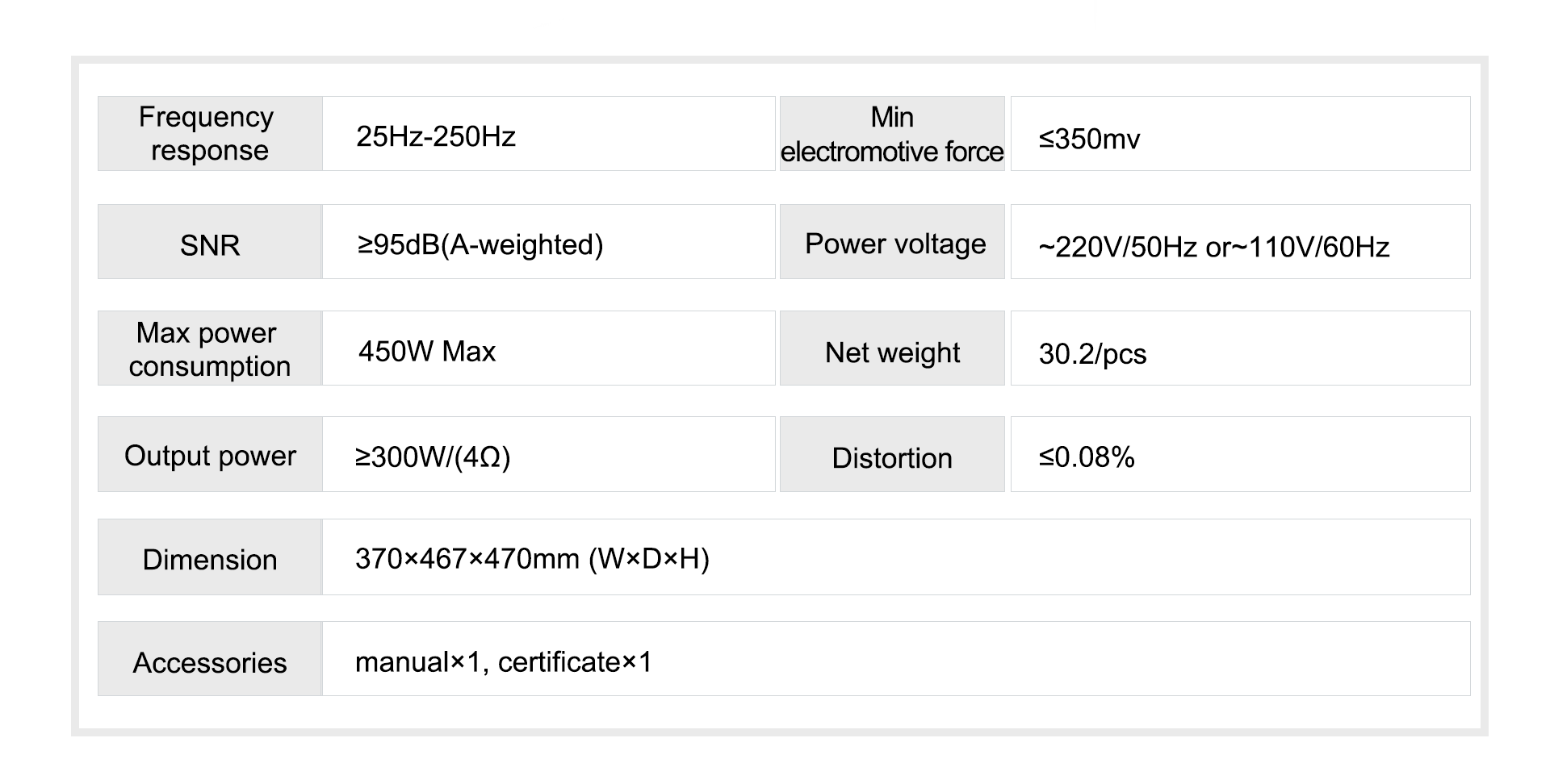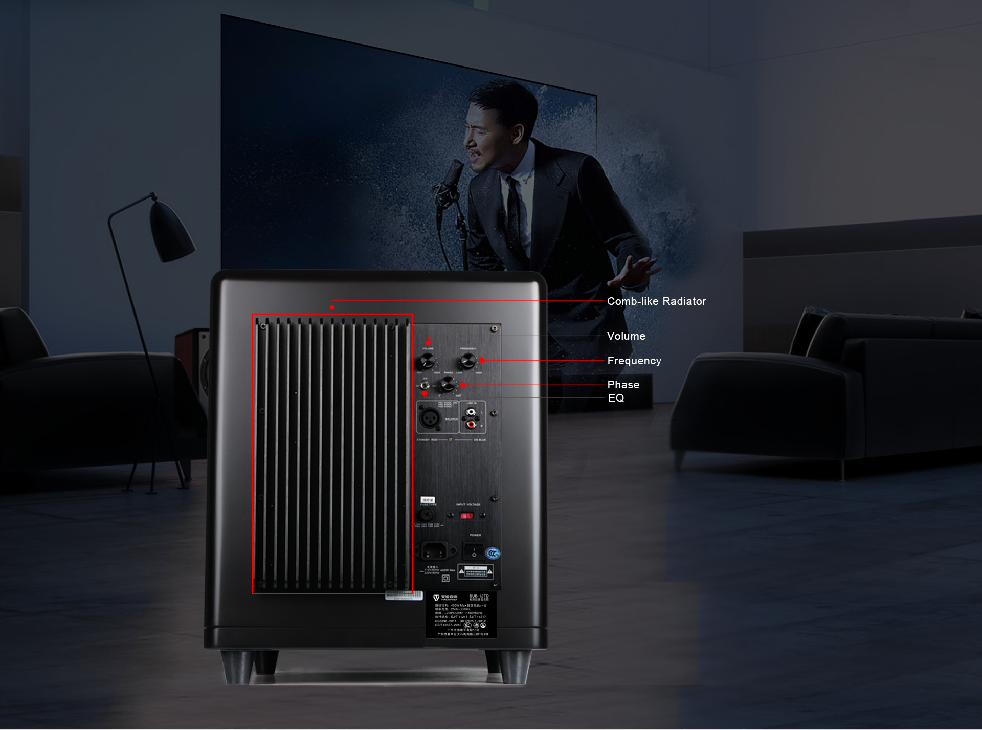 Állandó áramforrás áramkört, differenciálerősítő áramkört, push-pull áramkört és négy Toshiba Darlington tranzisztort alkalmaz a 300 W/4Ω kimeneti teljesítmény érdekében. Támogatja az áramkör-védelmet, beleértve a túláram, túlfeszültség, túlmelegedés és rövidzárlat elleni védelmet. 20 000 μF-os kondenzátort, Marcom kondenzátort és 400 VA transzformátort is alkalmaz. Ez a 12 hüvelykes basszushangszóró elegendő alacsony frekvenciájú élvezetet nyújt.