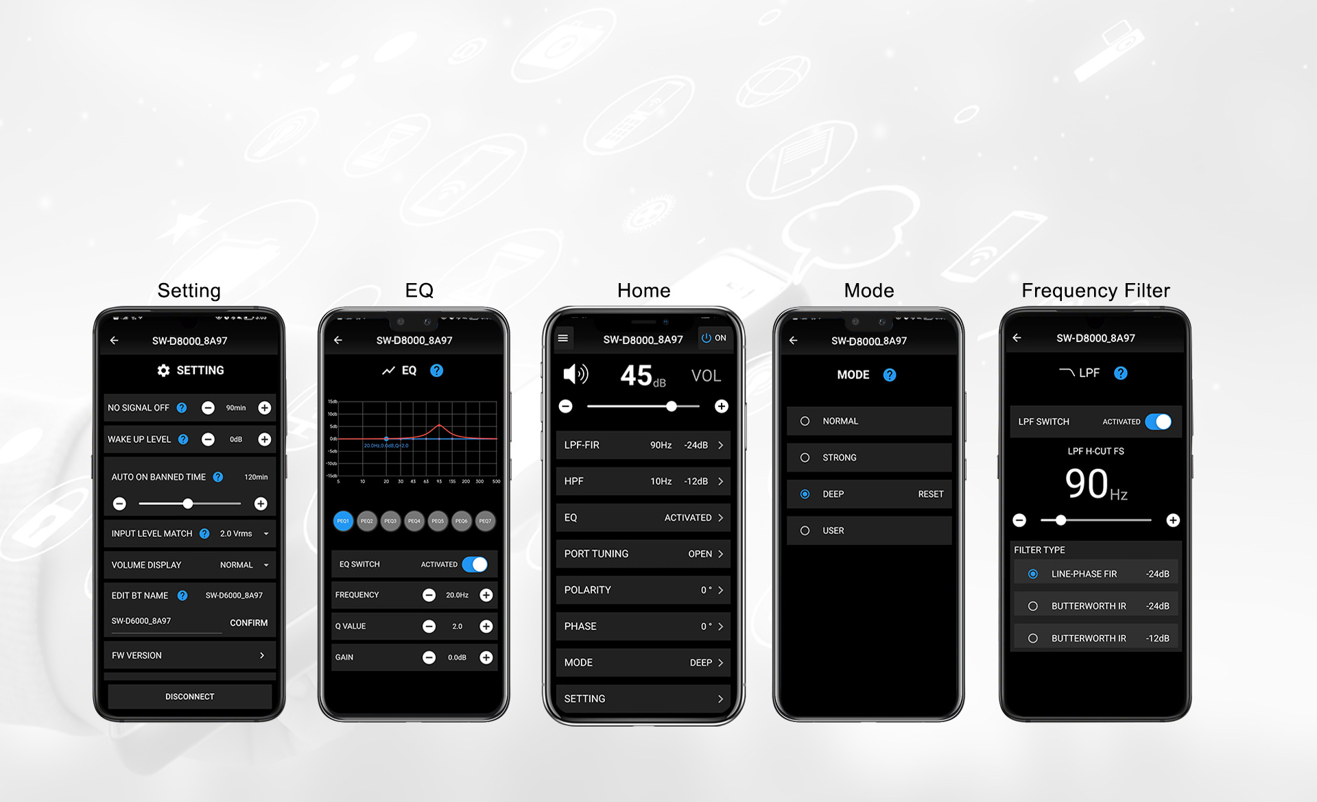 DSP digitális feldolgozás, LCD kijelző, érintőgombok, alkalmazásvezérlés, vezeték nélküli firmware frissítés, EQ beállítás, frekvenciatartomány-állítás, 0° és 180° között fázisváltás, szimmetrikus bemenet, automatikus energiatakarékosság jel nélkül.