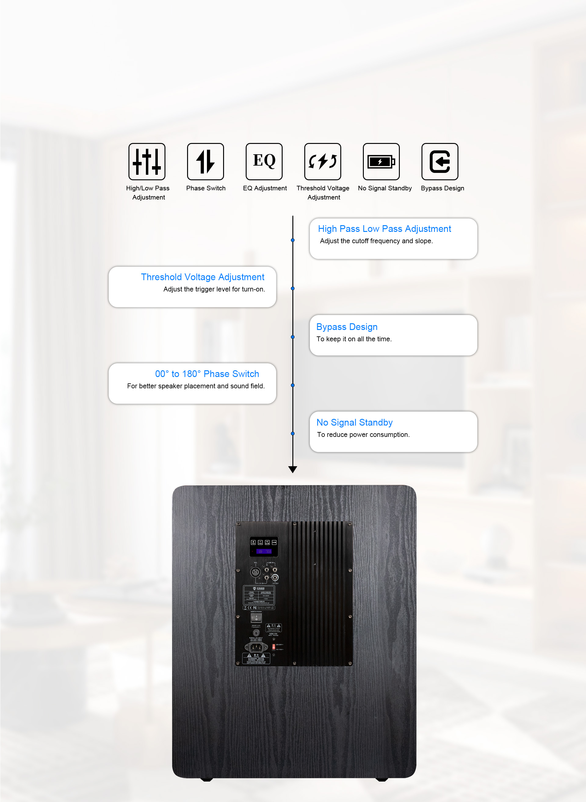 Több áramkörös védelmet alkalmaz, beleértve a túlfeszültség-védelmet, a túlmelegedés-védelmet, a túlterhelés-védelmet, a túláram-védelmet és a rövidzárlat-védelmet a hosszú távú basszusteljesítmény érdekében.
