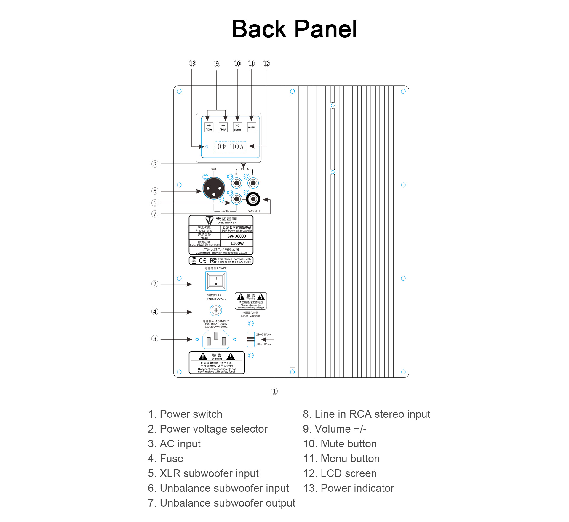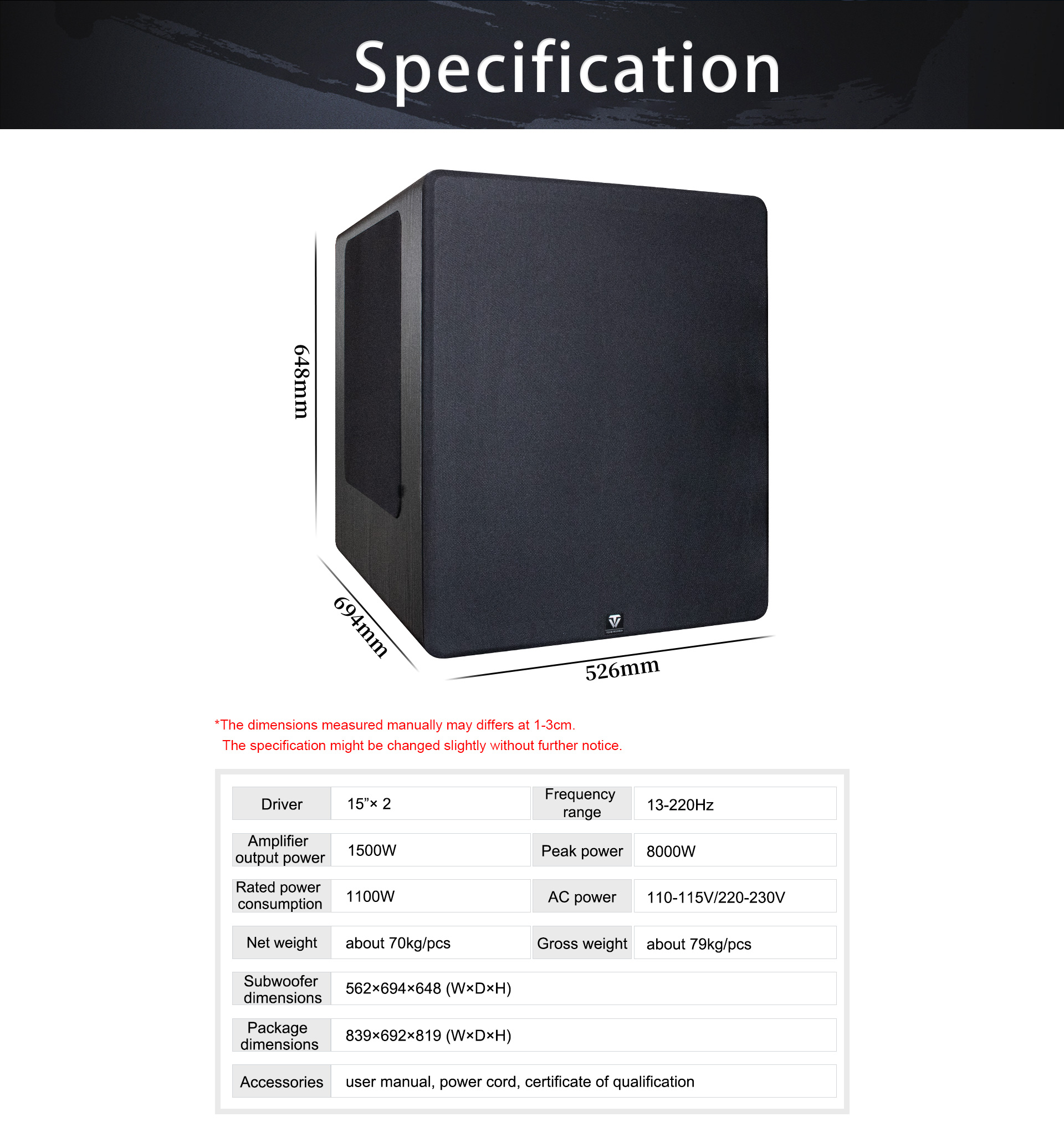 Az SW-D8000 egy dupla 15 hüvelykes, DSP-vel ellátott mélynyomó, 1500 W RMS/3 Ω és 8000 W/3 Ω csúcsteljesítménnyel. D osztályú erősítővel és beépített DSP-vel rendelkezik. Beépített Bluetooth-szal és alkalmazással rendelkezik a hangerő, a portok hangolása, a polaritás, a 0°-180° fázis, a HPF, az LPF, a meredekség, az EQ, a jel nélküli készenlét, az ébresztési szint, a bemeneti szint illesztése és négy hallgatási mód beállításához. Beépített Bluetooth-kapcsolattal rendelkezik, és támogatja a Tonewinner alkalmazást. Kína 10 legjobb audio márkájaként a Tonewinner több mint 30 éves tapasztalattal rendelkezik akusztikai termékek tervezésében és gyártásában. Eredeti beszállítóként a Tonewinner mindig szeretettel várja a forgalmazókat, kereskedőket, partnereket és ügyfeleket szerte a világon.