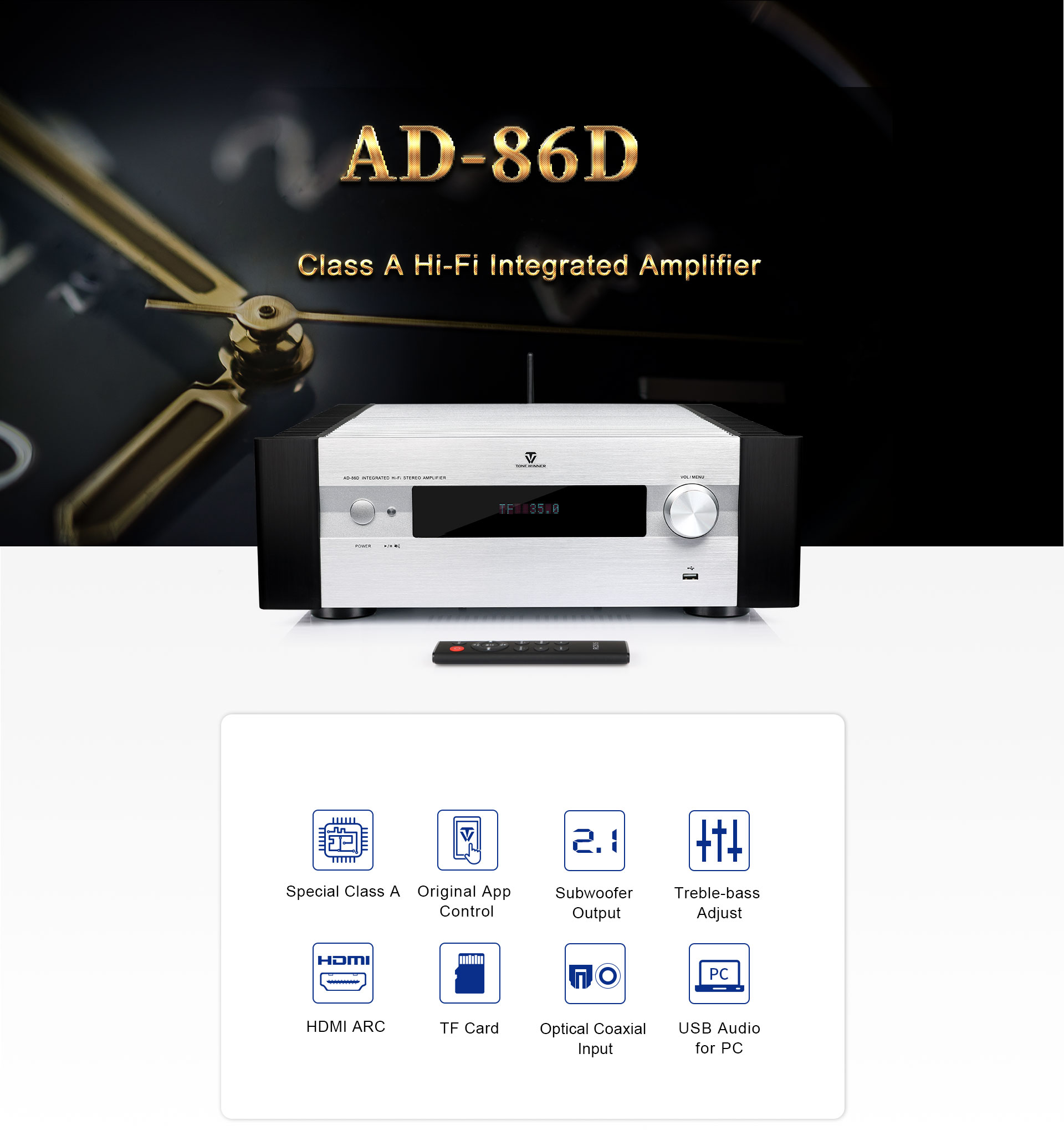 A modern otthonok kiváló minőségű és divatos termékek iránti igényeinek kielégítése érdekében a Tonewinner kifejlesztette a HIFI termékek új generációját. Az AD-86D HI-FI egyike ezeknek a termékeknek, amely egy új generációs középkategóriás HiFi erősítő, amely kielégíti a fiatal audiorajongók divatos megjelenés és kiváló hangzás iránti igényeit. Eredeti beszállítóként a Tonewinner mindig szeretettel várja a forgalmazókat, partnereket és ügyfeleket szerte a világon.