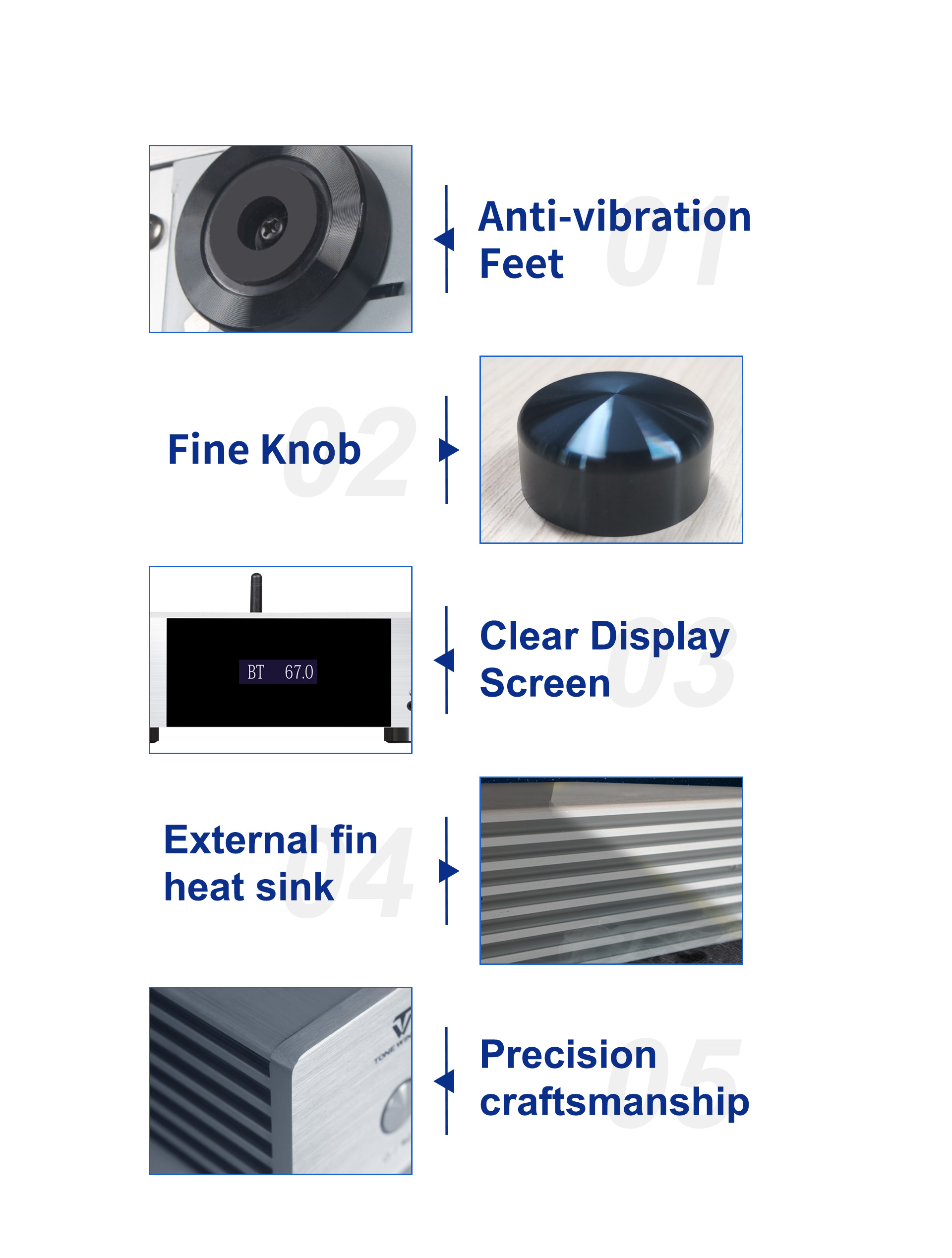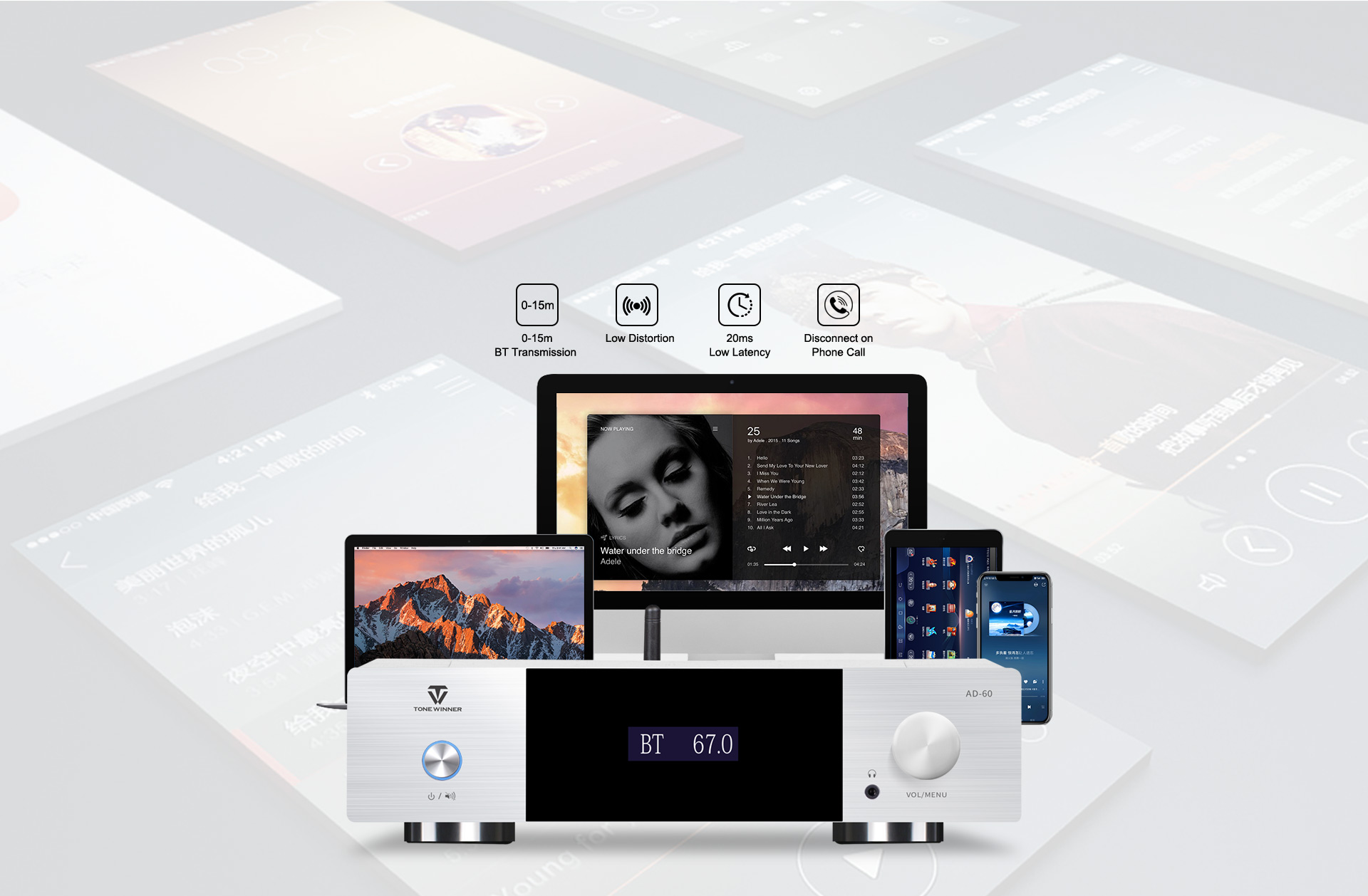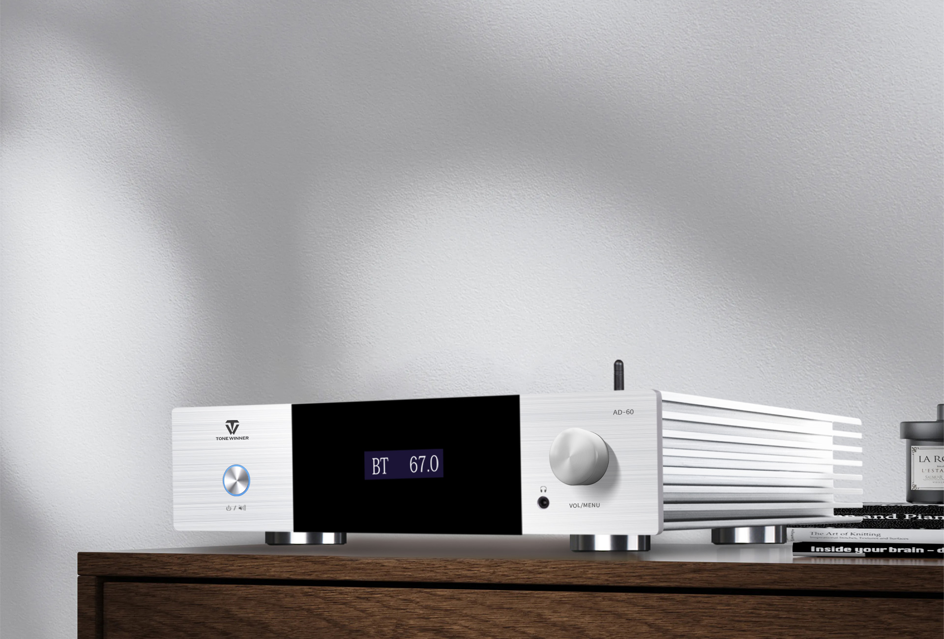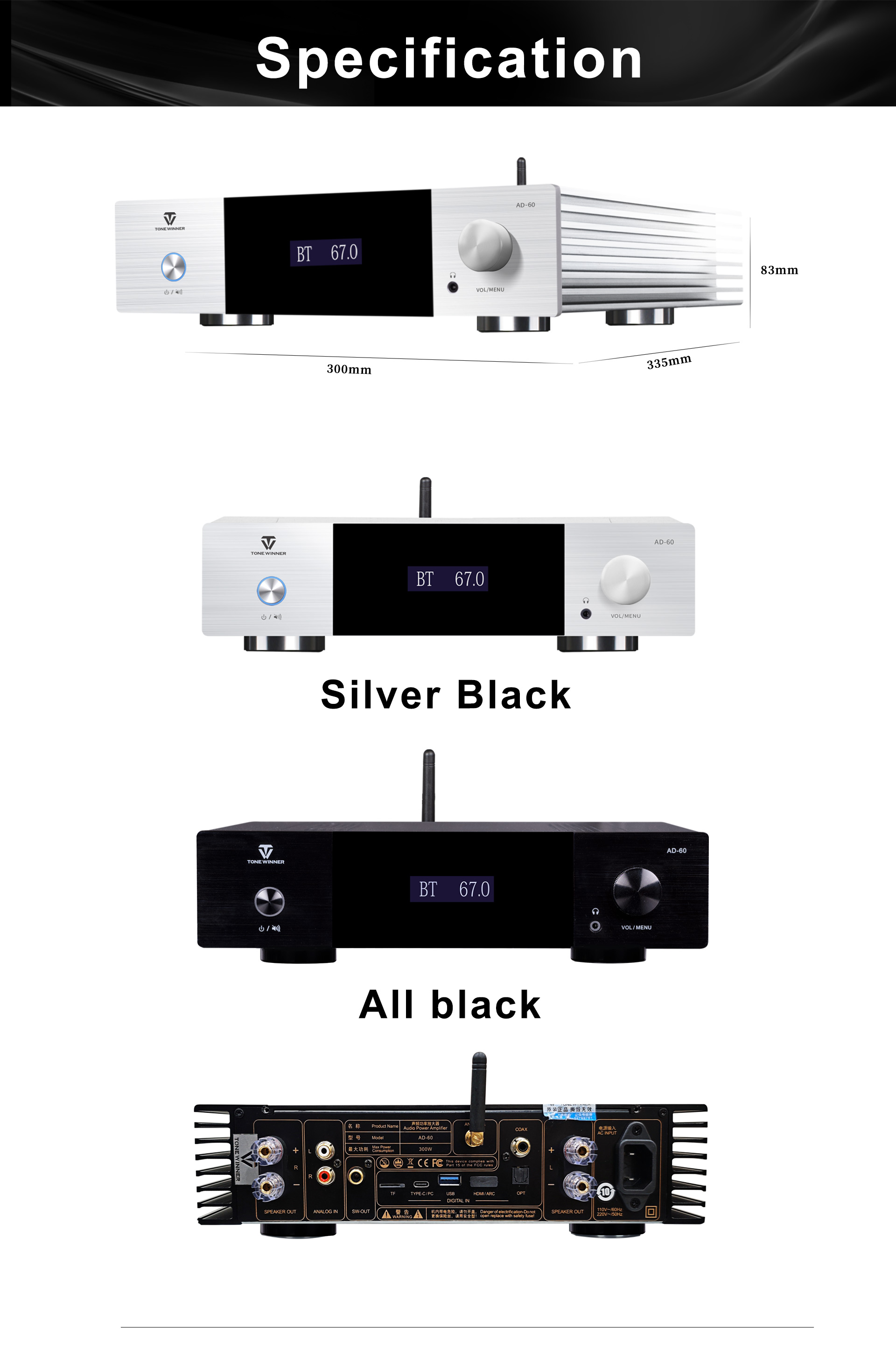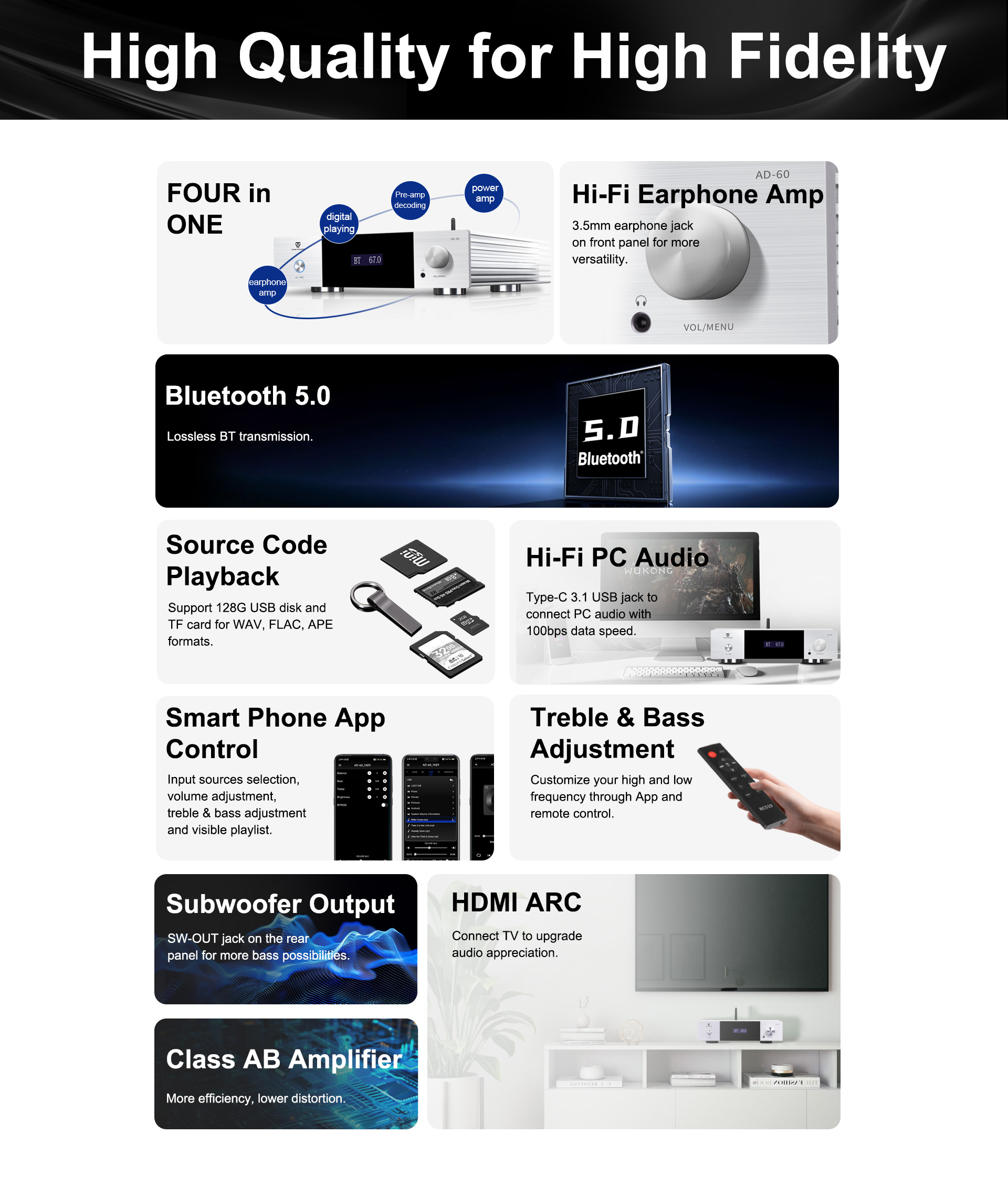 Az AD-60 egy AB osztályú integrált teljesítményerősítő, amely támogatja a 2.1-es rendszert. Egyesíti az előerősítő dekódolását, a teljesítményerősítőt, a digitális lejátszást és a fülhallgató erősítőt, támogatva a Bluetooth 5.0, USB-stick, TF-kártya, okostelefon-alkalmazás vezérlését és a digitális bemeneteket, beleértve az optikai, koaxiális és PC USB-Audio-t. Eredetileg minőségi anyagokból és alkatrészekből tervezték és gyártották az analitikus hangzás feltárása érdekében. Divatos és költséghatékony teljesítményerősítő a hifi hangzású szórakoztatáshoz.