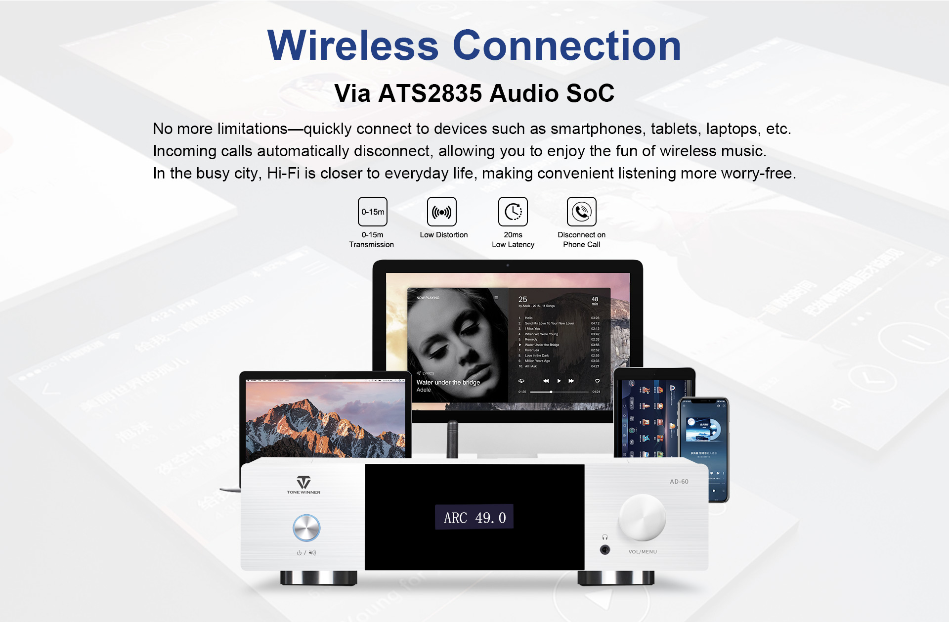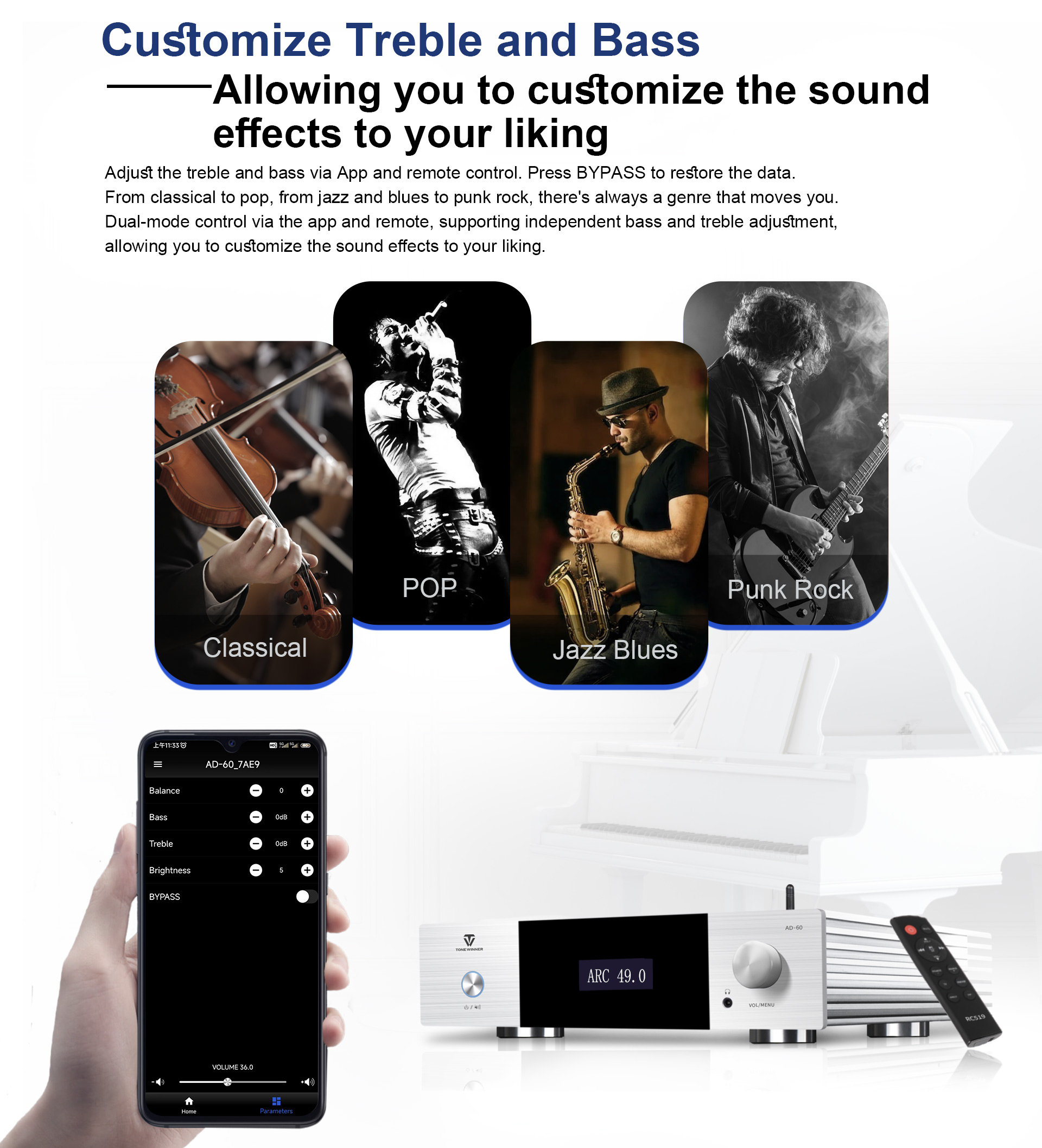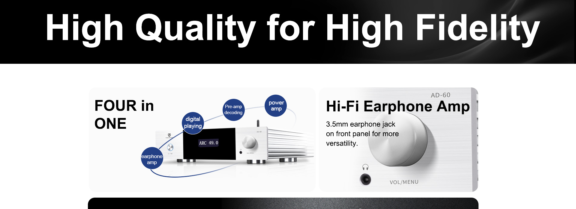 Az AD-60 egy AB osztályú integrált teljesítményerősítő, amely támogatja a 2.1-es rendszert. Egyesíti az előerősítő dekódolását, a teljesítményerősítőt, a digitális lejátszást és a fülhallgató erősítőt, USB-meghajtón, TF-kártyán, okostelefon-alkalmazás vezérlésén és digitális bemeneteken keresztül, beleértve az optikai, koaxiális és PC USB-Audio bemeneteket. Eredetileg minőségi anyagokból és alkatrészekből tervezték és gyártották az analitikus hangzás feltárása érdekében. Divatos és költséghatékony teljesítményerősítő a hifi hangzású szórakoztatáshoz.