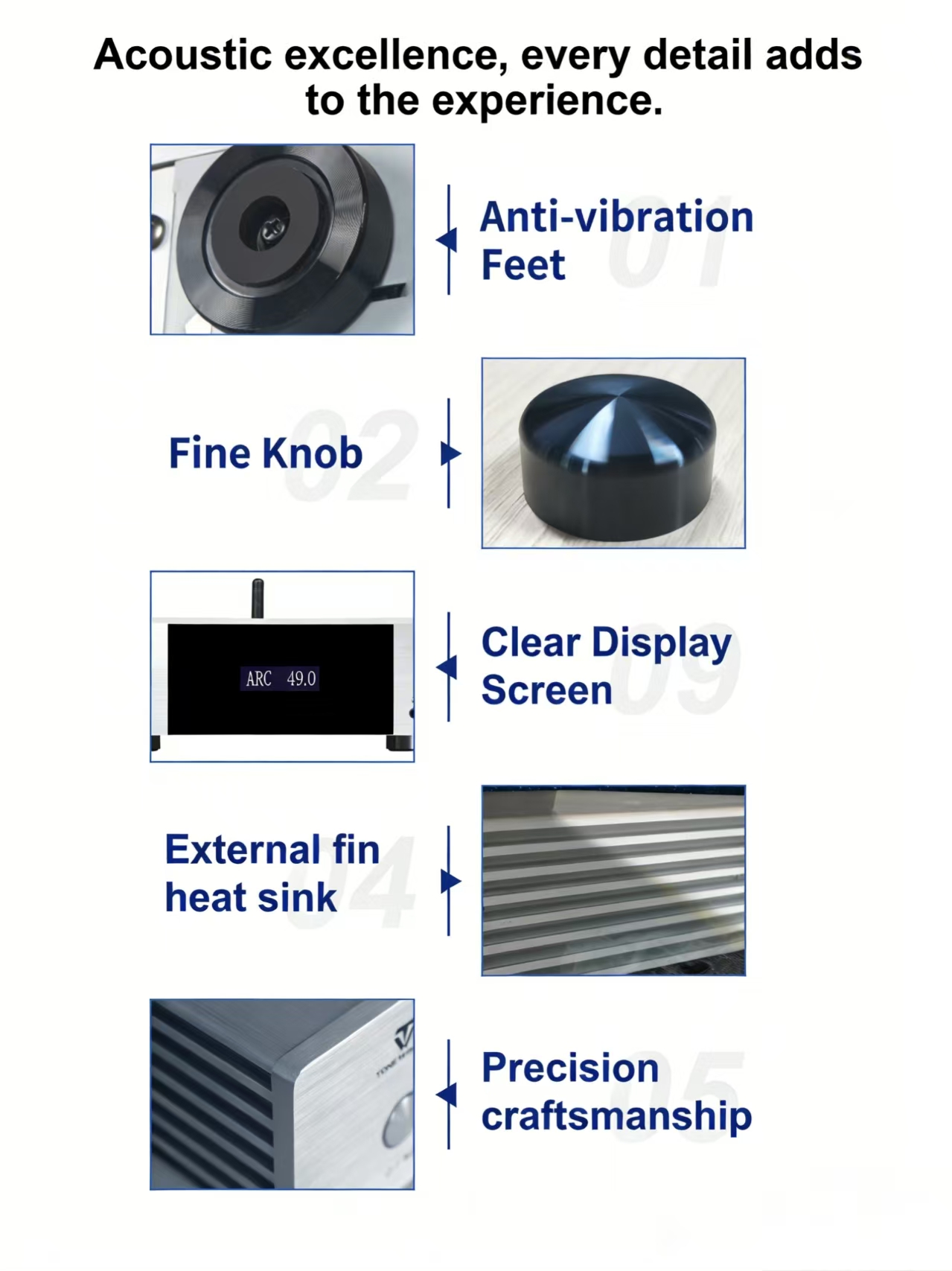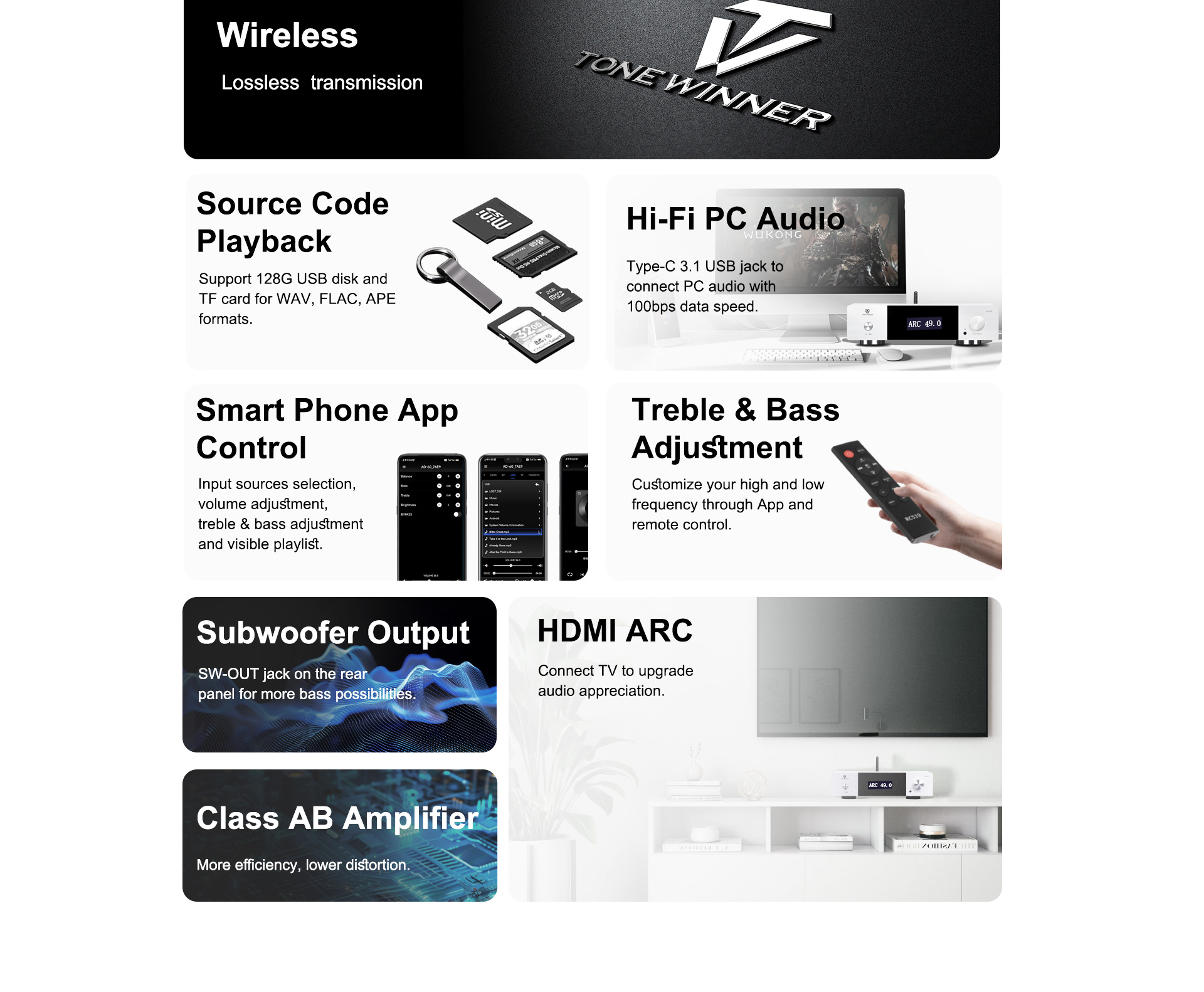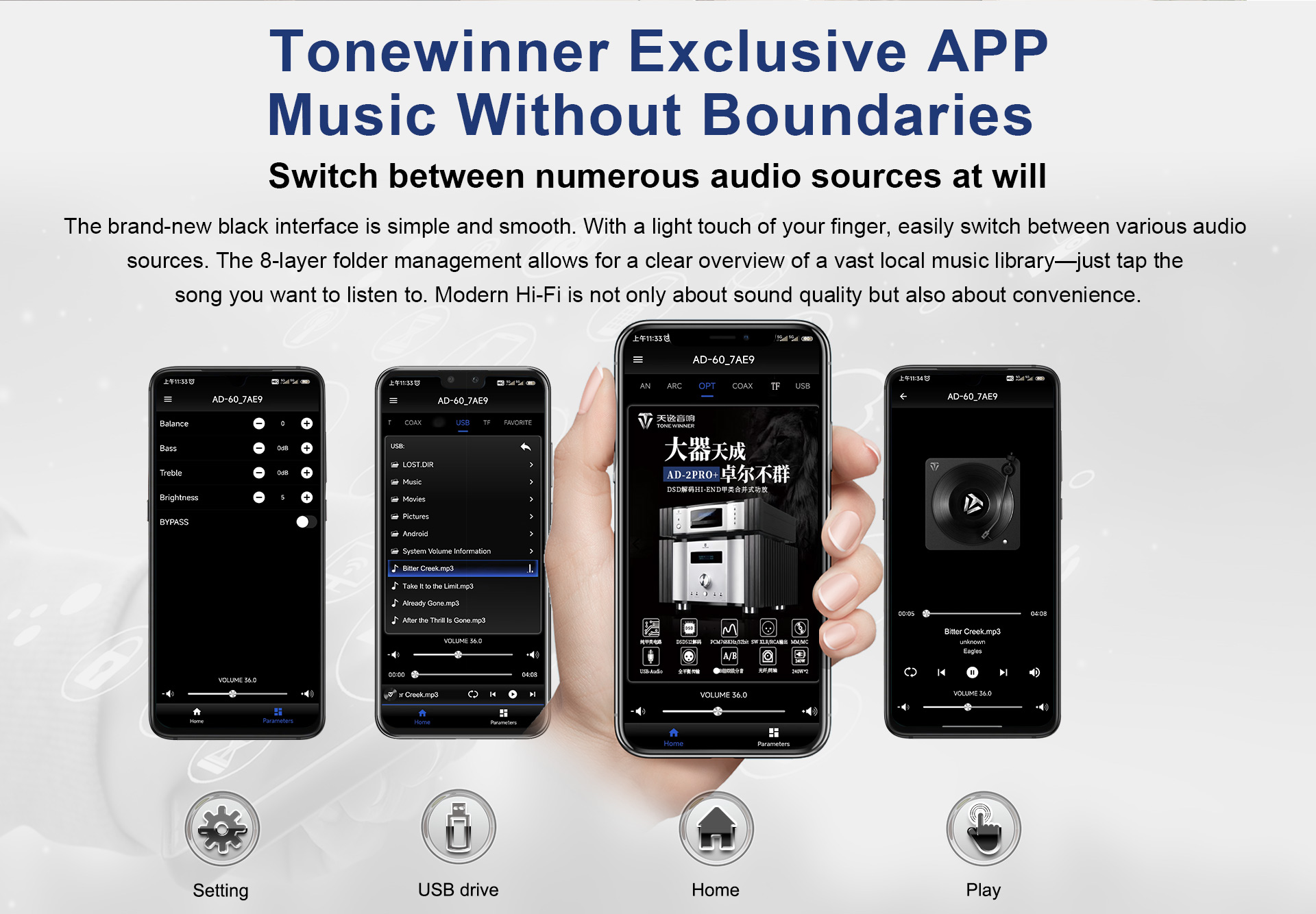 Az AD-60 egy AB osztályú integrált teljesítményerősítő, amely támogatja a 2.1-es rendszert. Egyesíti az előerősítő dekódolását, a teljesítményerősítőt, a digitális lejátszást és a fülhallgató erősítőt, USB-meghajtón, TF-kártyán, okostelefon-alkalmazás vezérlésén és digitális bemeneteken keresztül, beleértve az optikai, koaxiális és PC USB-Audio bemeneteket. Eredetileg minőségi anyagokból és alkatrészekből tervezték és gyártották az analitikus hangzás feltárása érdekében. Divatos és költséghatékony teljesítményerősítő a hifi hangzású szórakoztatáshoz.