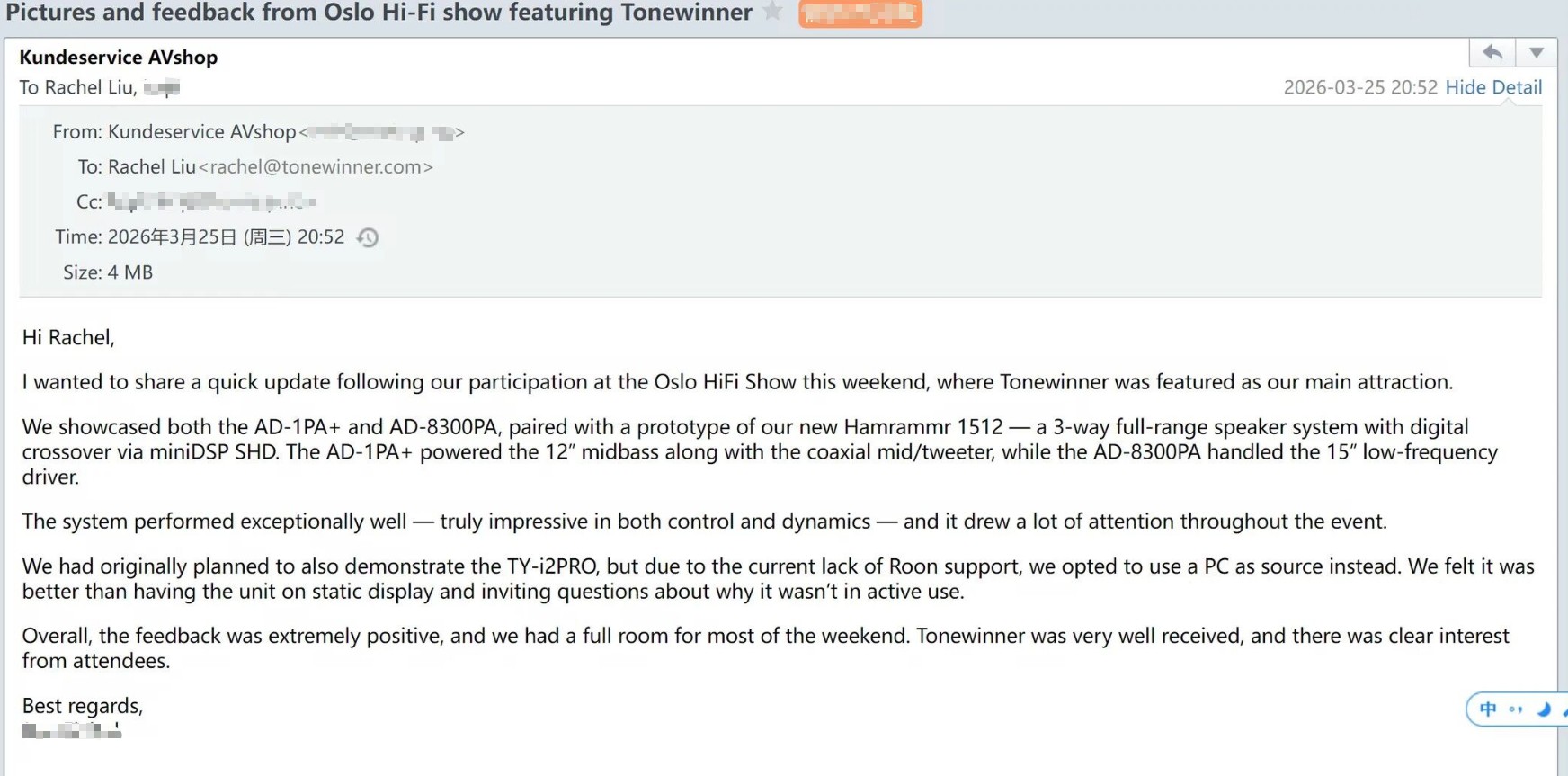 Az esemény után helyi forgalmazónk egy e-mailt küldött, amelyben nagyra méltatta a Tonewinner erősítők kiemelkedő hangminőségét és erős teljesítményét, kifejezve termékeink teljes elismerését a kiállításon.
