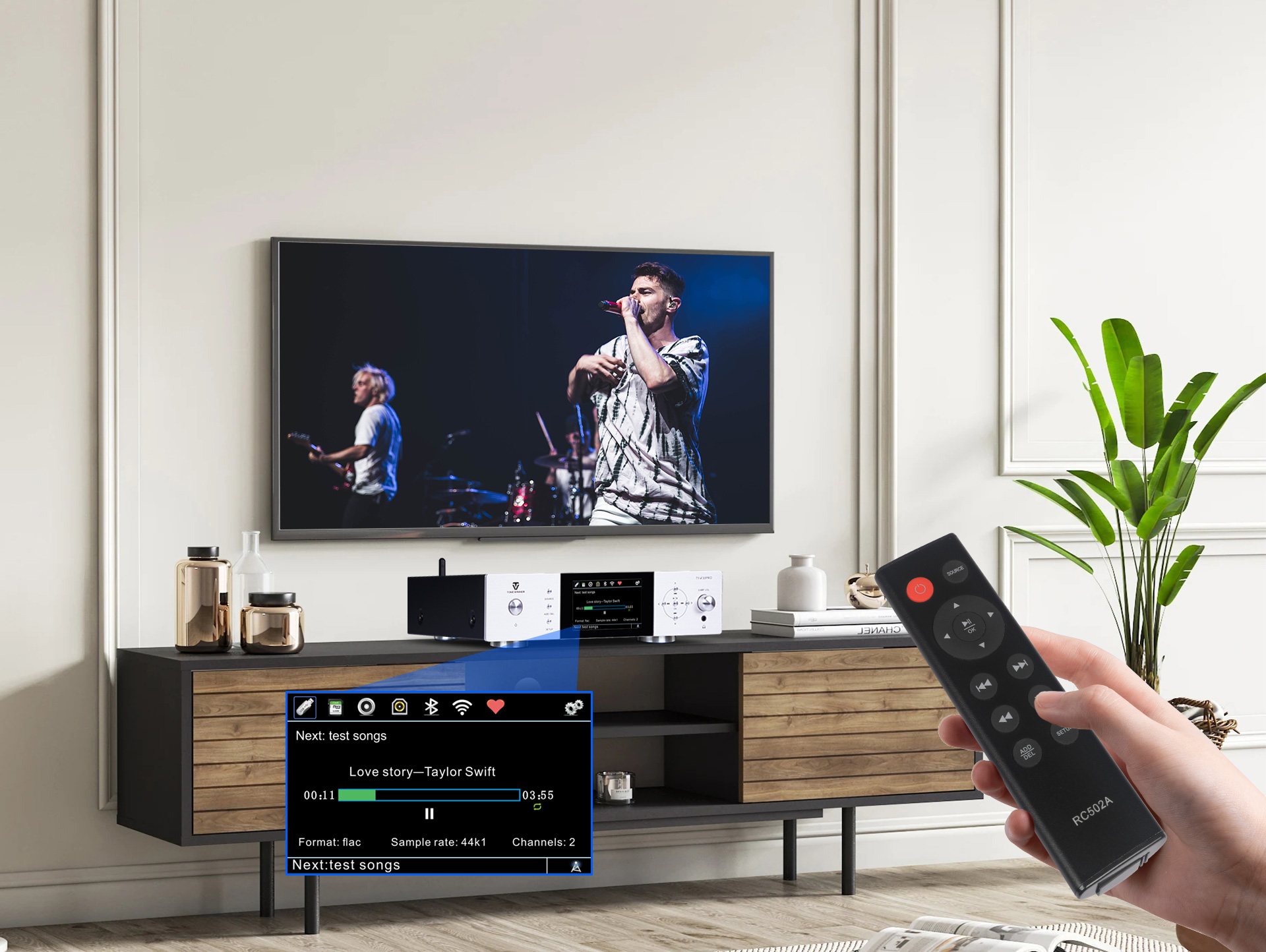 A mobiltelefon-alkalmazás és a készülék képernyője szinkronban jelenik meg. A 9 rétegű mappakezelés lehetővé teszi kedvenc dalainak összegyűjtését a helyi zenei könyvtárból, új kategorizált lejátszási listák létrehozását, valamint tartalom hozzáadását vagy törlését bármikor.