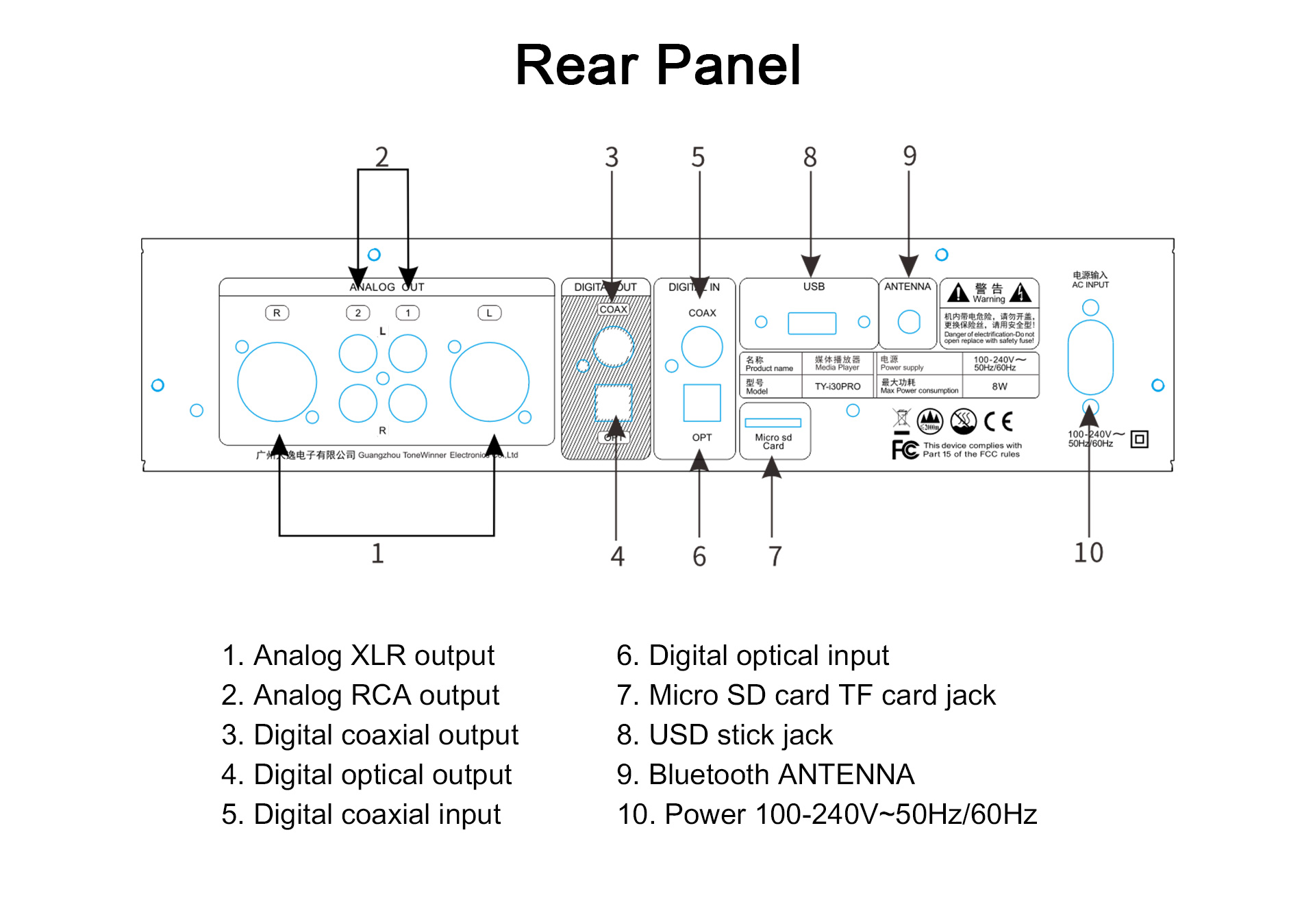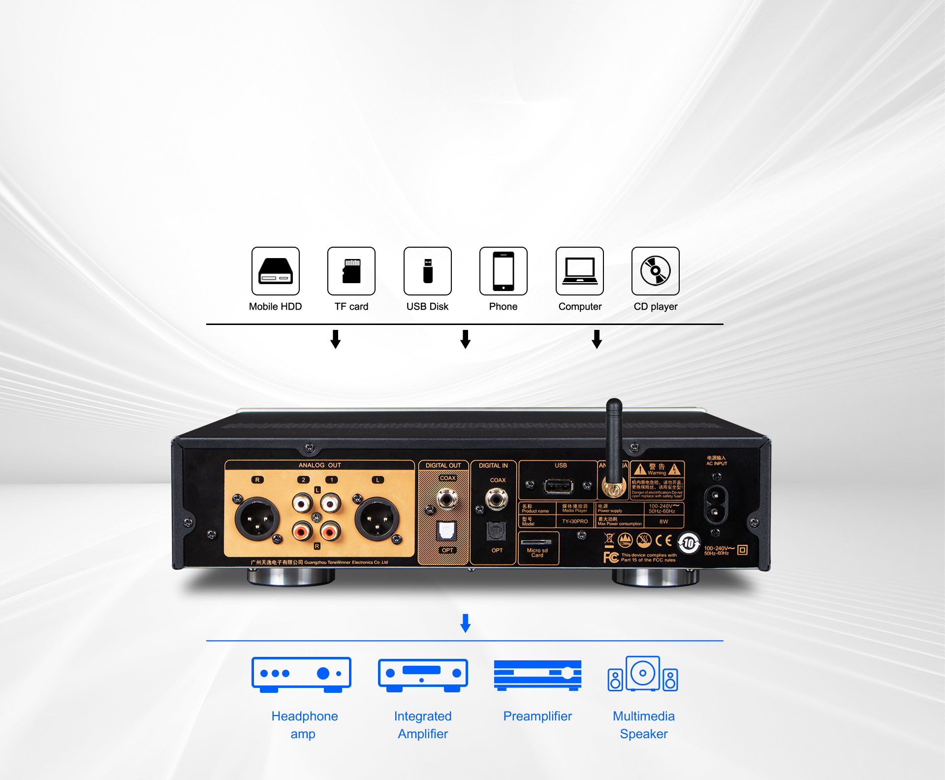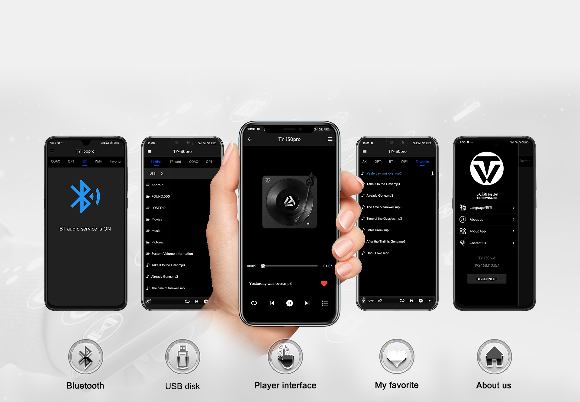 A TY-i30PRO egy új, multifunkciós médialejátszó, amelyet a ToneWinner dobott piacra. DLNA, AIRPLAY vagy Bluetooth kapcsolaton keresztül képes fogadni mobiltelefonról, iPadről, notebookról és más eszközökről érkező dalokat. A TY-i30PRO támogatja a 2 TB-os mobil merevlemez, TF-kártyák és USB flash meghajtók helyi lejátszását, támogatja a veszteségmentes zenei formátumokat, például a WAV/FLAC és az APE-t, előlapi 3,5 mm-es fejhallgató-csatlakozóval rendelkezik, és támogatja az optikai, koaxiális, 192 kHz/24 bites PCM digitális stream formátumú bemenetet és kimenetet.