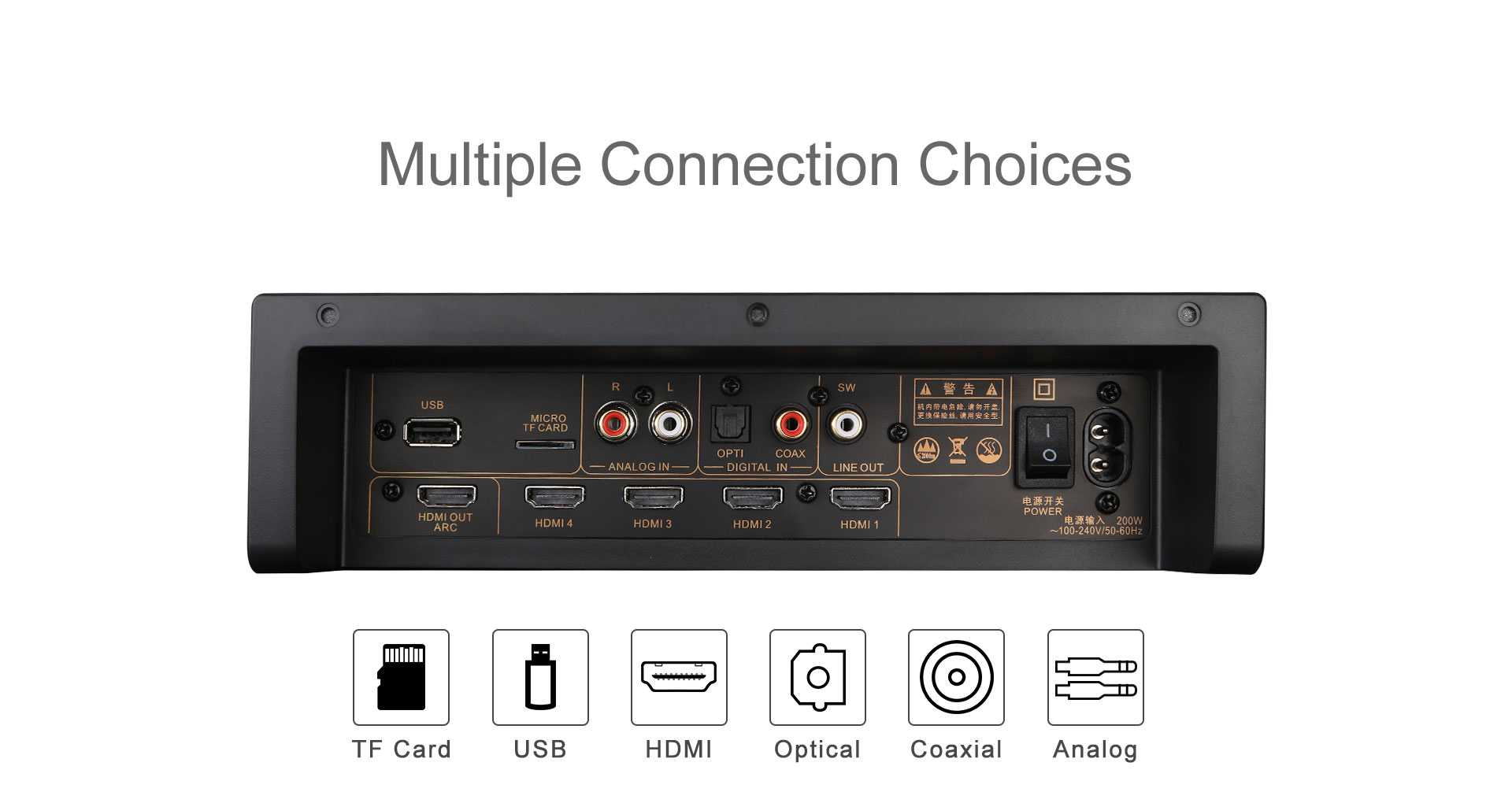 4 utas HDMI2. 1 , 1 irányú USB, 1 irányú TF kártya, 1 irányú optikai, 1 irányú koaxiális, 1 irányú analóg. |