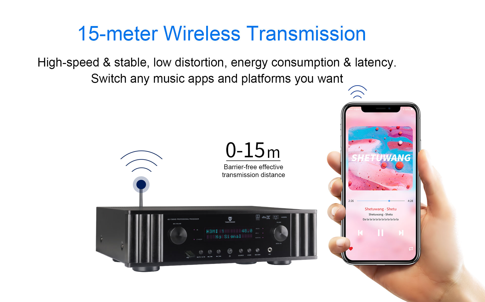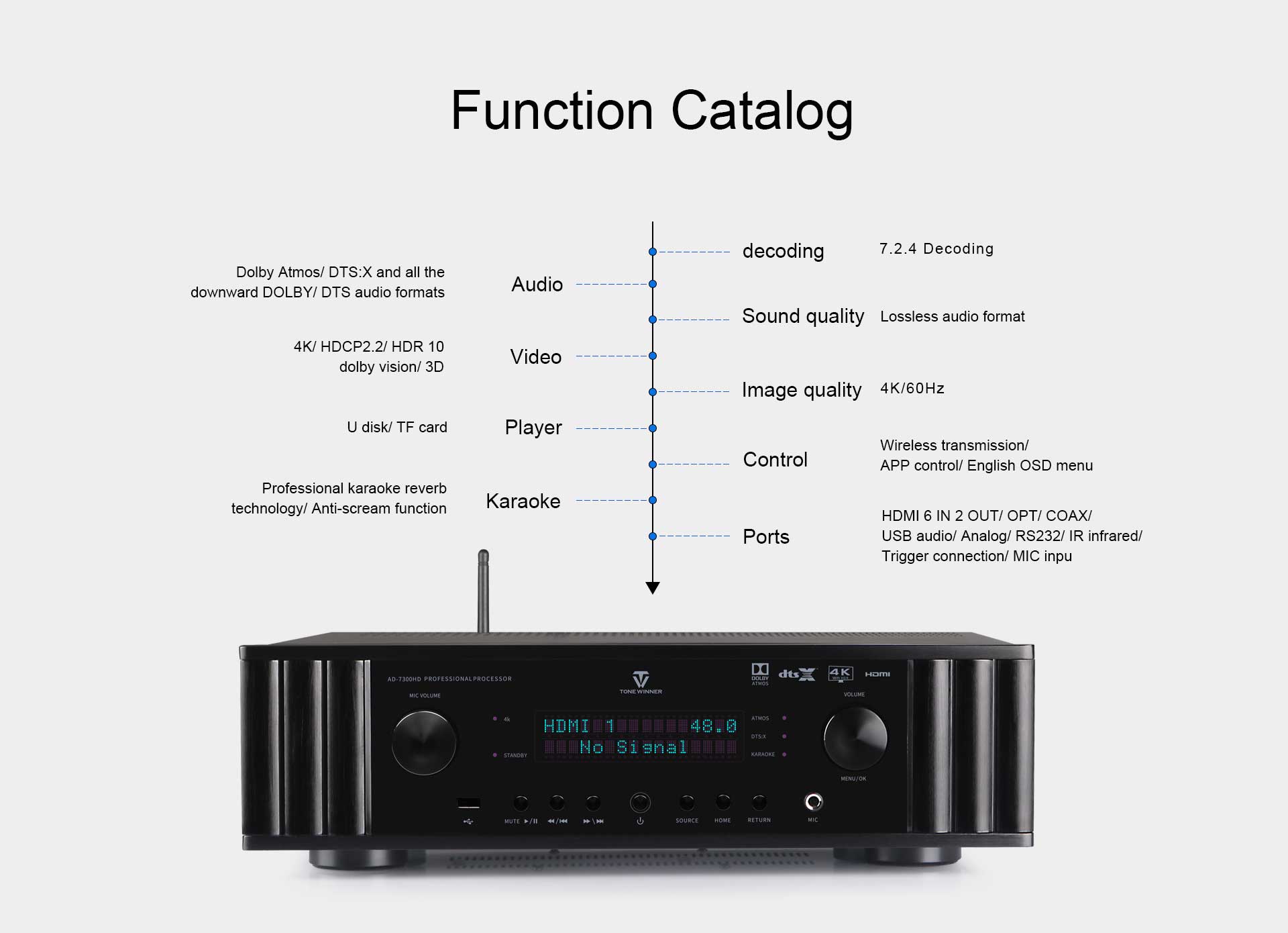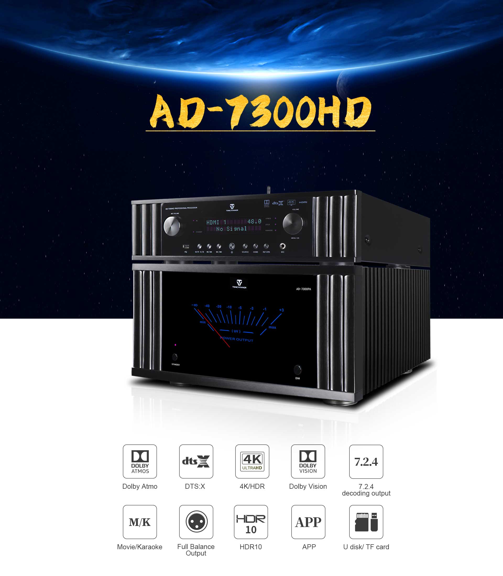 Az AD-7300HD egy zenei, mozi és karaoke integrált audio-video processzor. Támogatja a Dolby Atmos, DTS:X, 4K dekódolást, és kompatibilis a 3D, HDR, Dolby Vision stb. formátumokkal. Támogatja az OSD rétegmenüt, a mátrix alcsoportot és az automatikus EQ kalibrálást. Emellett támogatja az alkalmazásvezérlést, az USB-lemezt és a TF-kártyát is. Többfunkciós dekóderként méltó az otthoni szórakoztatáshoz magával ragadó hanghatással.